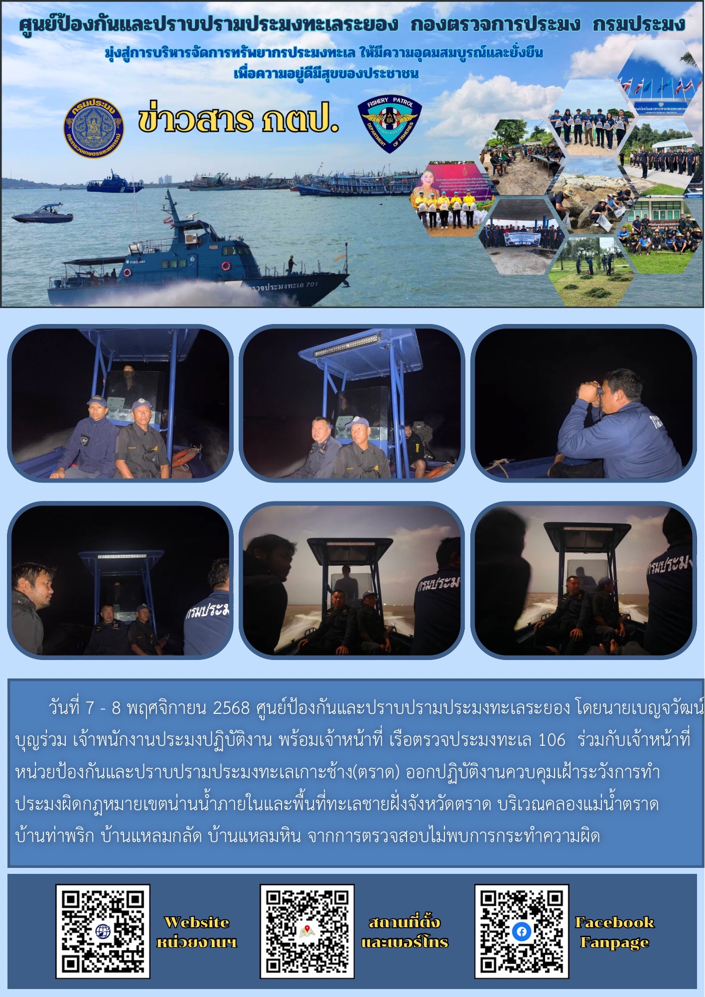 วันที่ 7 - 8 พฤศจิกายน 2568 ศูนย์ป้องกันและปราบปรามประมงทะเลระยอง โดยนายเบญจวัฒน์ บุญร่วม เจ้าพนักงานประมงปฏิบัติงาน พร้อมเจ้าหน้าที่ เรือตรวจประมงทะเล 106  ร่วมกับเจ้าหน้าที่หน่วยป้องกันและปราบปรามประมงทะเลเกาะช้าง(ตราด) ออกปฏิบัติงานควบคุมเฝ้าระวังการทำประมงผิดกฎหมายเขตน่านน้ำภายในและพื้นที่ทะเลชายฝั่งจังหวัดตราด บริเวณคลองแม่น้ำตราด บ้านท่าพริก บ้านแหลมกลัด บ้านแหลมหิน จากการตรวจสอบไม่พบการกระทำความผิด