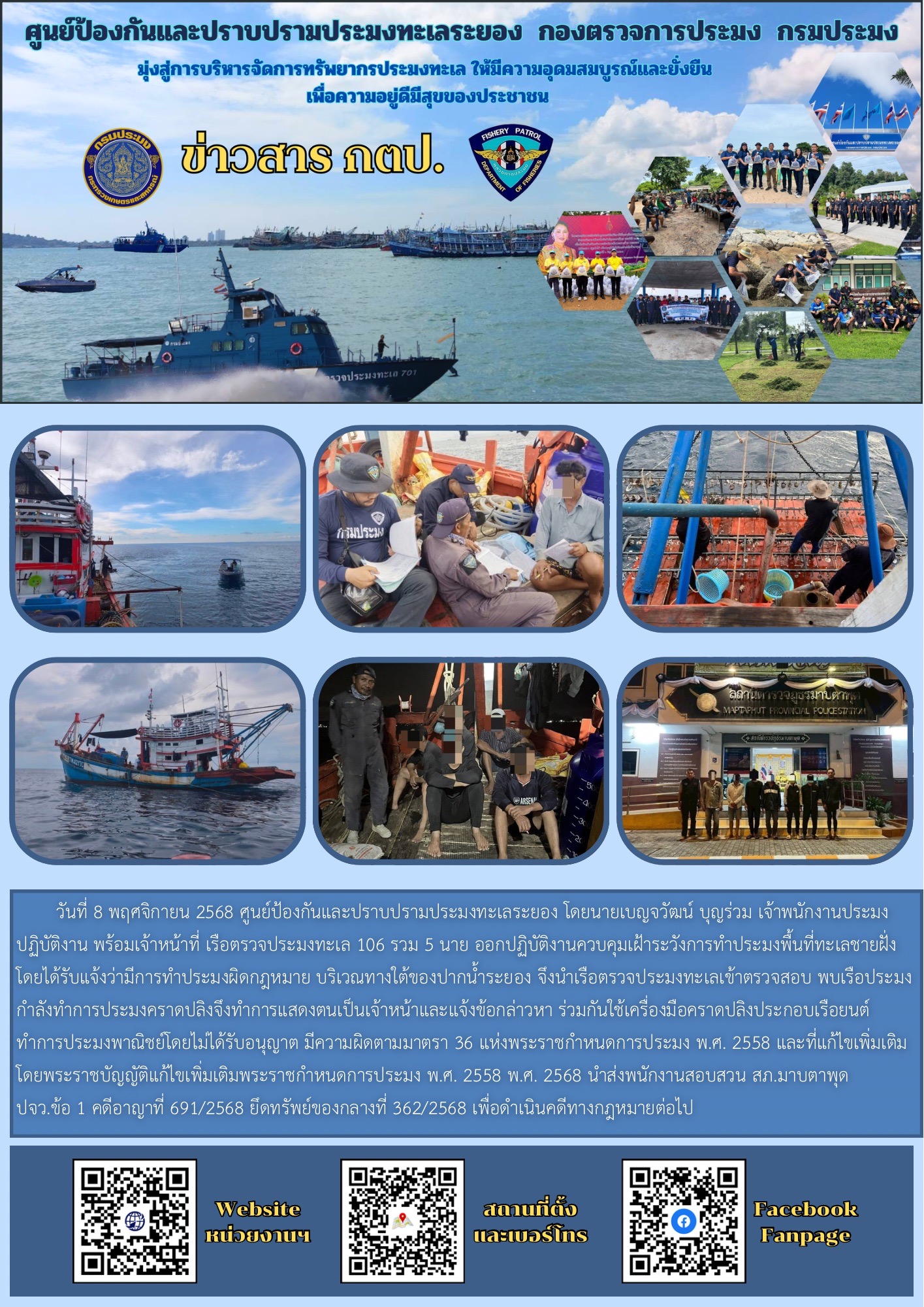 วันที่ 8 พฤศจิกายน 2568 ศูนย์ป้องกันและปราบปรามประมงทะเลระยอง โดยนายเบญจวัฒน์ บุญร่วม เจ้าพนักงานประมงปฏิบัติงาน พร้อมเจ้าหน้าที่ เรือตรวจประมงทะเล 106 รวม 5 นาย ออกปฏิบัติงานควบคุมเฝ้าระวังการทำประมงพื้นที่ทะเลชายฝั่ง โดยได้รับแจ้งว่ามีการทำประมงผิดกฎหมาย บริเวณทางใต้ของปากน้ำระยอง จึงนำเรือตรวจประมงทะเลเข้าตรวจสอบ พบเรือประมงกำลังทำการประมงคราดปลิงจึงทำการแสดงตนเป็นเจ้าหน้าและแจ้งข้อกล่าวหา ร่วมกันใช้เครื่องมือคราดปลิงประกอบเรือยนต์ ทำการประมงพาณิชย์โดยไม่ได้รับอนุญาต มีความผิดตามมาตรา 36 แห่งพระราชกำหนดการประมง พ.ศ. 2558 และที่แก้ไขเพิ่มเติม โดยพระราชบัญญัติแก้ไขเพิ่มเติมพระราชกำหนดการประมง พ.ศ. 2558 พ.ศ. 2568 นำส่งพนักงานสอบสวน สภ.มาบตาพุด ปจว.ข้อ 1 คดีอาญาที่ 691/2568 ยึดทรัพย์ของกลางที่ 362/2568 เพื่อดำเนินคดีทางกฎหมายต่อไป