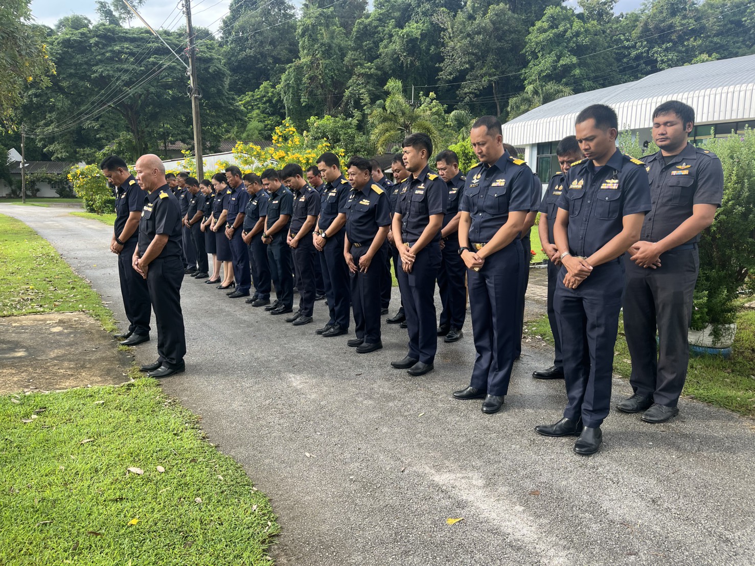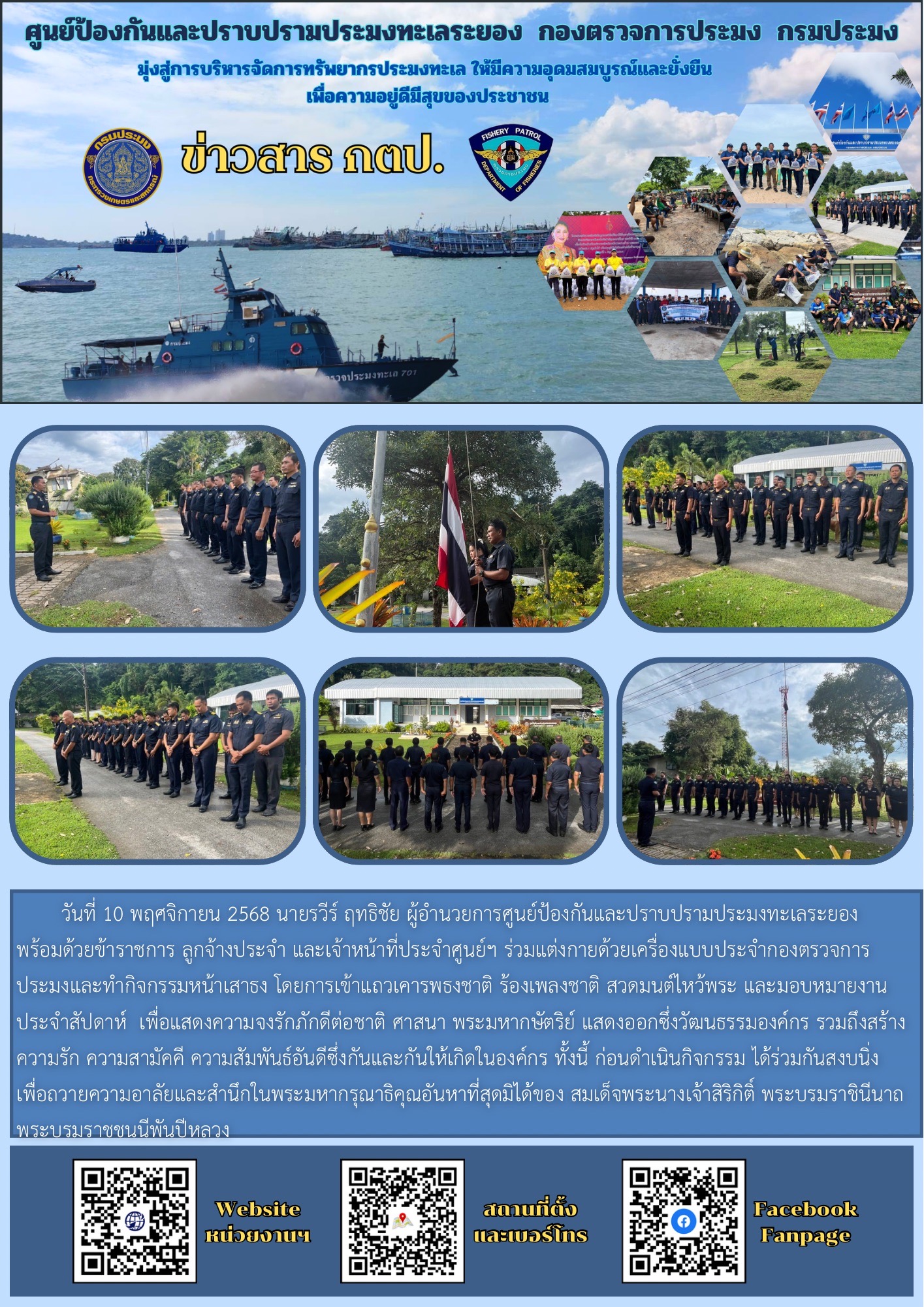 วันที่ 10 พฤศจิกายน 2568 นายรวีร์ ฤทธิชัย ผู้อำนวยการศูนย์ป้องกันและปราบปรามประมงทะเลระยอง พร้อมด้วยข้าราชการ ลูกจ้างประจำ และเจ้าหน้าที่ประจำศูนย์ฯ ร่วมแต่งกายด้วยเครื่องแบบประจำกองตรวจการประมงและทำกิจกรรมหน้าเสาธง โดยการเข้าแถวเคารพธงชาติ ร้องเพลงชาติ สวดมนต์ไหว้พระ และมอบหมายงาน ประจำสัปดาห์  เพื่อแสดงความจงรักภักดีต่อชาติ ศาสนา พระมหากษัตริย์ แสดงออกซึ่งวัฒนธรรมองค์กร รวมถึงสร้างความรัก ความสามัคคี ความสัมพันธ์อันดีซึ่งกันและกันให้เกิดในองค์กร ทั้งนี้ ก่อนดำเนินกิจกรรม ได้ร่วมกันสงบนิ่งเพื่อถวายความอาลัยและสำนึกในพระมหากรุณาธิคุณอันหาที่สุดมิได้ของ สมเด็จพระนางเจ้าสิริกิติ์ พระบรมราชินีนาถ พระบรมราชชนนีพันปีหลวง