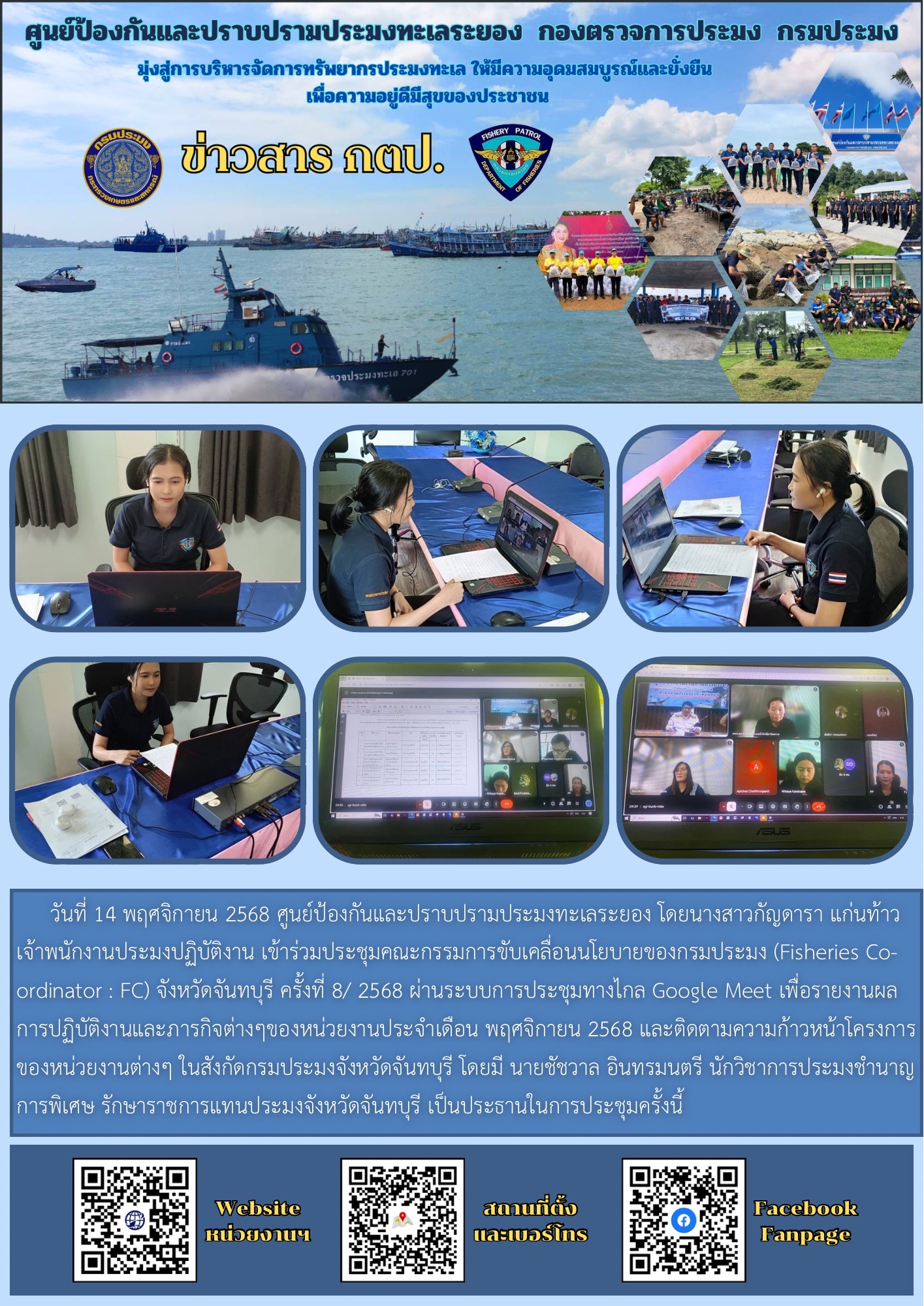 วันที่ 14 พฤศจิกายน 2568 ศูนย์ป้องกันและปราบปรามประมงทะเลระยอง โดยนางสาวกัญดารา แก่นท้าว เจ้าพนักงานประมงปฏิบัติงาน เข้าร่วมประชุมคณะกรรมการขับเคลื่อนนโยบายของกรมประมง (Fisheries Co-ordinator : FC) จังหวัดจันทบุรี ครั้งที่ 8/ 2568 ผ่านระบบการประชุมทางไกล Google Meet เพื่อรายงานผลการปฏิบัติงานและภารกิจต่างๆของหน่วยงานประจำเดือน พฤศจิกายน 2568 และติดตามความก้าวหน้าโครงการของหน่วยงานต่างๆ ในสังกัดกรมประมงจังหวัดจันทบุรี โดยมี นายชัชวาล อินทรมนตรี นักวิชาการประมงชำนาญการพิเศษ รักษาราชการแทนประมงจังหวัดจันทบุรี เป็นประธานในการประชุมครั้งนี้