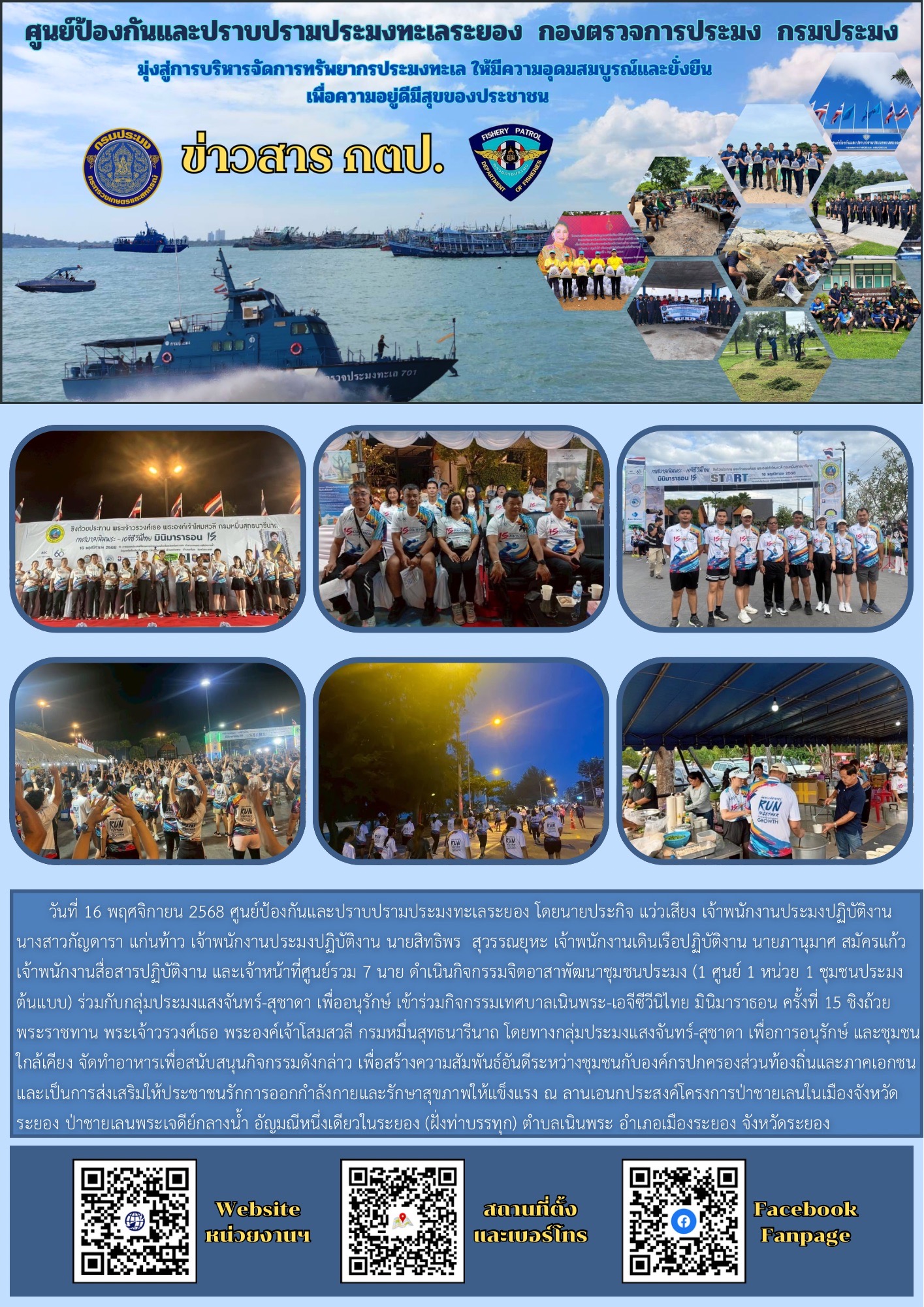 วันที่ 16 พฤศจิกายน 2568 ศูนย์ป้องกันและปราบปรามประมงทะเลระยอง โดยนายประกิจ แว่วเสียง เจ้าพนักงานประมงปฏิบัติงาน นางสาวกัญดารา แก่นท้าว เจ้าพนักงานประมงปฏิบัติงาน นายสิทธิพร  สุวรรณยุหะ เจ้าพนักงานเดินเรือปฏิบัติงาน นายภานุมาศ สมัครแก้ว เจ้าพนักงานสื่อสารปฏิบัติงาน และเจ้าหน้าที่ศูนย์รวม 7 นาย ดำเนินกิจกรรมจิตอาสาพัฒนาชุมชนประมง (1 ศูนย์ 1 หน่วย 1 ชุมชนประมงต้นแบบ) ร่วมกับกลุ่มประมงแสงจันทร์-สุชาดา เพื่ออนุรักษ์ เข้าร่วมกิจกรรมเทศบาลเนินพระ-เอจีซีวีนิไทย มินิมาราธอน ครั้งที่ 15 ชิงถ้วยพระราชทาน พระเจ้าวรวงศ์เธอ พระองค์เจ้าโสมสวลี กรมหมื่นสุทธนารีนาถ โดยทางกลุ่มประมงแสงจันทร์-สุชาดา เพื่อการอนุรักษ์ และชุมชนใกล้เคียง จัดทำอาหารเพื่อสนับสนุนกิจกรรมดังกล่าว เพื่อสร้างความสัมพันธ์อันดีระหว่างชุมชนกับองค์กรปกครองส่วนท้องถิ่นและภาคเอกชน และเป็นการส่งเสริมให้ประชาชนรักการออกกำลังกายและรักษาสุขภาพให้แข็งแรง ณ ลานเอนกประสงค์โครงการป่าชายเลนในเมืองจังหวัดระยอง ป่าชายเลนพระเจดีย์กลางน้ำ อัญมณีหนึ่งเดียวในระยอง (ฝั่งท่าบรรทุก) ตำบลเนินพระ อำเภอเมืองระยอง จังหวัดระยอง