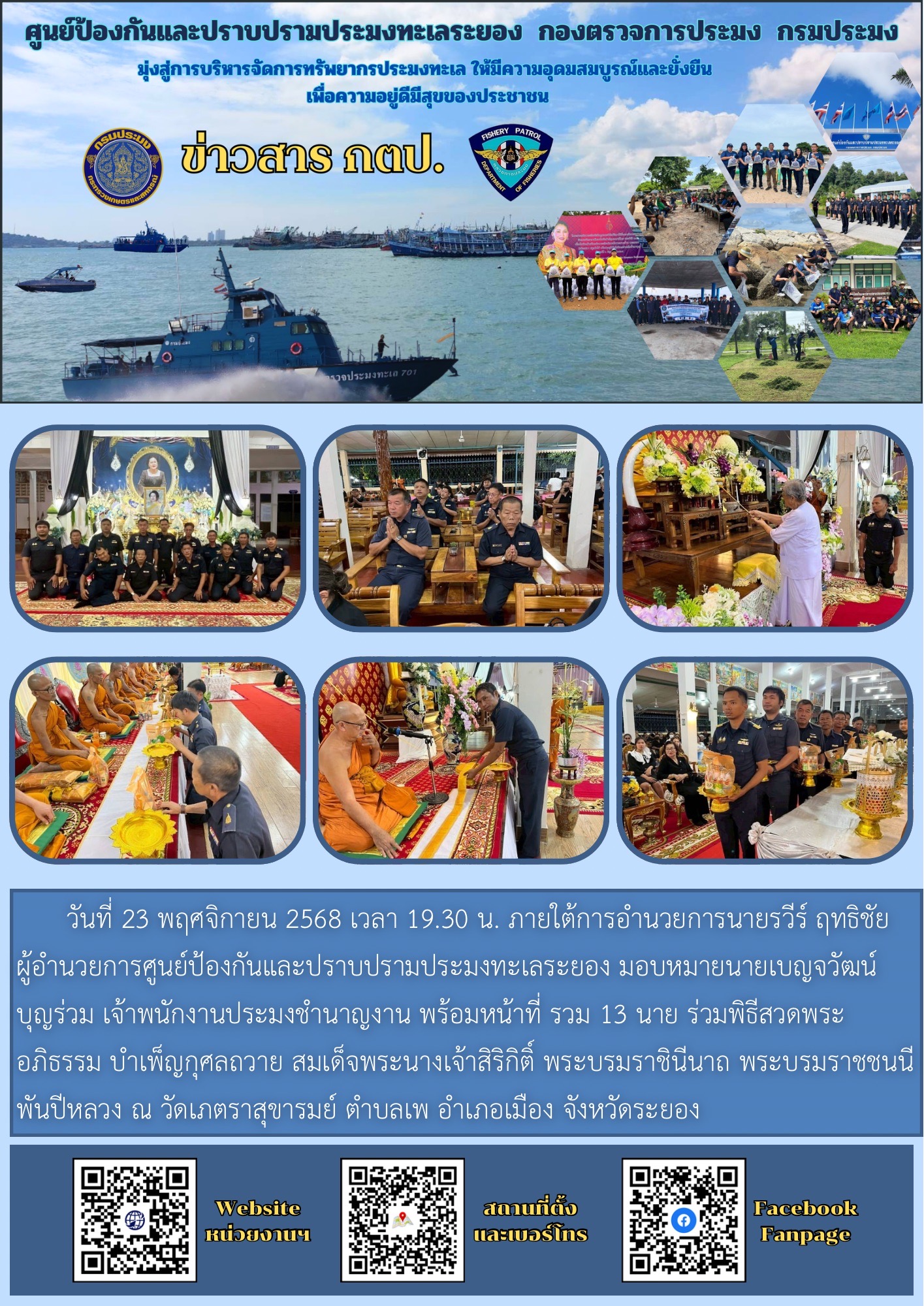 วันที่ 23 พฤศจิกายน 2568 เวลา 19.30 น. ภายใต้การอำนวยการนายรวีร์ ฤทธิชัย ผู้อํานวยการศูนย์ป้องกันและปราบปรามประมงทะเลระยอง มอบหมายนายเบญจวัฒน์ บุญร่วม เจ้าพนักงานประมงชำนาญงาน พร้อมหน้าที่ รวม 13 นาย ร่วมพิธีสวดพระอภิธรรม บําเพ็ญกุศลถวาย สมเด็จพระนางเจ้าสิริกิติ์ พระบรมราชินีนาถ พระบรมราชชนนีพันปีหลวง ณ วัดเภตราสุขารมย์ ตําบลเพ อําเภอเมือง จังหวัดระยอง