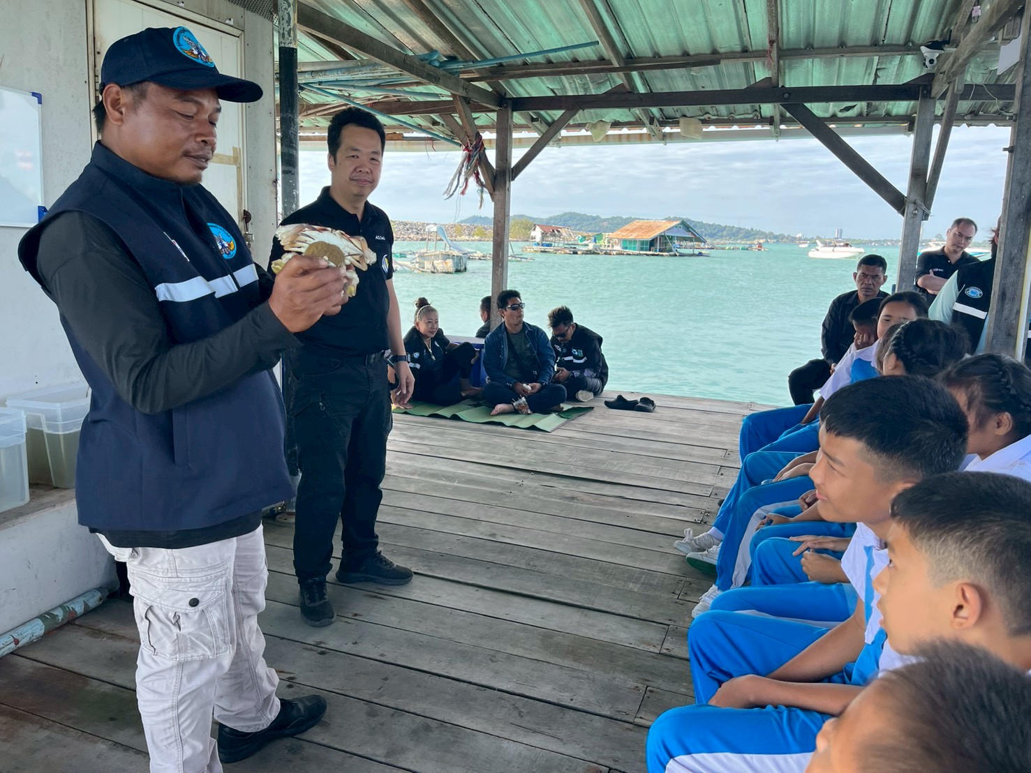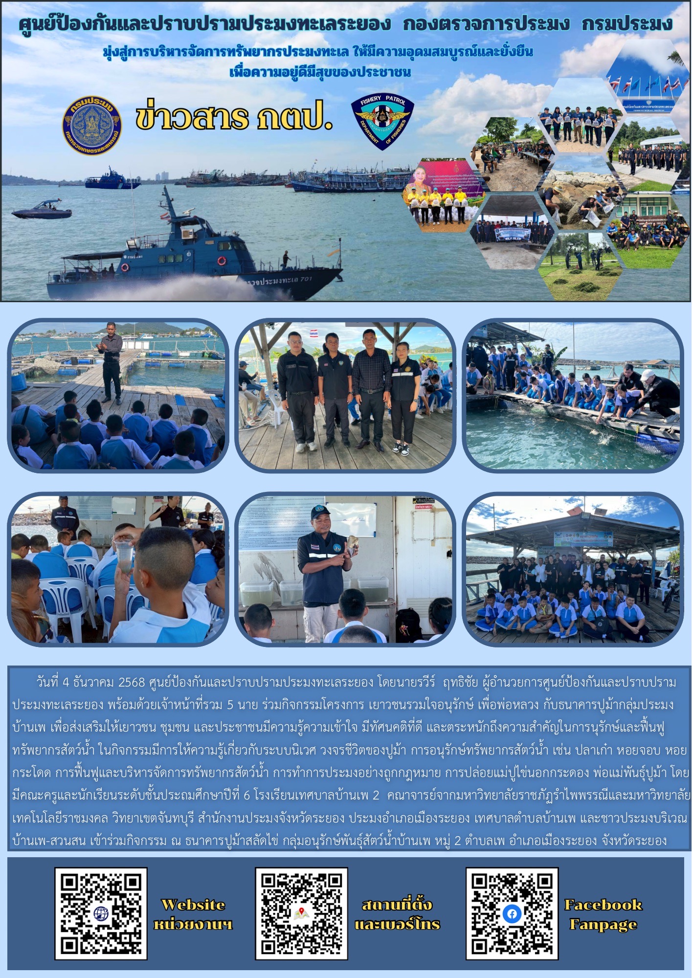 วันที่ 4 ธันวาคม 2568 ศูนย์ป้องกันและปราบปรามประมงทะเลระยอง โดยนายรวีร์  ฤทธิชัย ผู้อำนวยการศูนย์ป้องกันและปราบปรามประมงทะเลระยอง พร้อมด้วยเจ้าหน้าที่รวม 5 นาย ร่วมกิจกรรมโครงการ เยาวชนรวมใจอนุรักษ์ เพื่อพ่อหลวง กับธนาคารปูม้ากลุ่มประมงบ้านเพ  เพื่อส่งเสริมให้เยาวชน ชุมชน และประชาชนมีความรู้ความเข้าใจ มีทัศนคติที่ดี และตระหนักถึงความสำคัญในการนุรักษ์และฟื้นฟูทรัพยากรสัตว์น้ำ ในกิจกรรมมีการให้ความรู้เกี่ยวกับระบบนิเวศ วงจรชีวิตของปูม้า การอนุรักษ์ทรัพยากรสัตว์น้ำ เช่น ปลาเก๋า หอยจอบ หอยกระโดด การฟื้นฟูและบริหารจัดการทรัพยากรสัตว์น้ำ การทำการประมงอย่างถูกกฎหมาย การปล่อยแม่ปูไข่นอกกระดอง พ่อแม่พันธุ์ปูม้า โดยมีคณะครูและนักเรียนระดับชั้นประถมศึกษาปีที่ 6 โรงเรียนเทศบาลบ้านเพ 2  คณาจารย์จากมหาวิทยาลัยราชภัฏรำไพพรรณีและมหาวิทยาลัยเทคโนโลยีราชมงคล วิทยาเขตจันทบุรี สำนักงานประมงจังหวัดระยอง ประมงอำเภอเมืองระยอง เทศบาลตำบลบ้านเพ และชาวประมงบริเวณบ้านเพ-สวนสน เข้าร่วมกิจกรรม ณ ธนาคารปูม้าสลัดไข่ กลุ่มอนุรักษ์พันธุ์สัตว์น้ำบ้านเพ หมู่ 2 ตำบลเพ อำเภอเมืองระยอง จังหวัดระยอง
