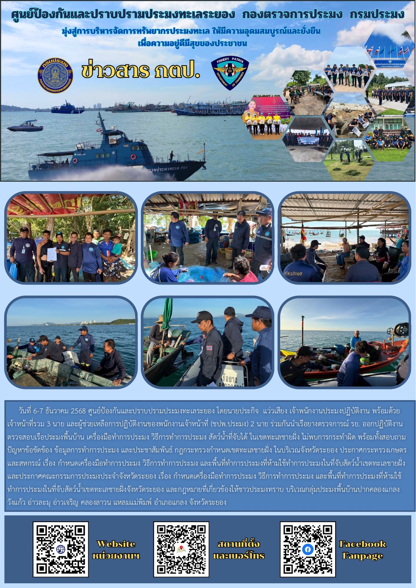 วันที่ 6-7 ธันวาคม 2568 ศูนย์ป้องกันและปราบปรามประมงทะเลระยอง โดยนายประกิจ  แว่วเสียง เจ้าพนักงานประมงปฏิบัติงาน พร้อมด้วยเจ้าหน้าที่รวม 3 นาย และผู้ช่วยเหลือการปฏิบัติงานของพนักงานเจ้าหน้าที่ (ชปพ.ประมง) 2 นาย ร่วมกันนำเรือยางตรวจการณ์ รย. ออกปฏิบัติงานตรวจสอบเรือประมงพื้นบ้าน เครื่องมือทำการประมง วิธีการทำการประมง สัตว์น้ำที่จับได้ ในเขตทะเลชายฝั่ง ไม่พบการกระทำผิด พร้อมทั้งสอบถามปัญหาข้อขัดข้อง ข้อมูลการทำการประมง และประชาสัมพันธ์ กฎกระทรวงกำหนดเขตทะเลชายฝั่ง ในบริเวณจังหวัดระยอง ประกาศกระทรวงเกษตรและสหกรณ์ เรื่อง กำหนดเครื่องมือทำการประมง วิธีการทำการประมง และพื้นที่ทำการประมงที่ห้ามใช้ทำการประมงในที่จับสัตว์น้ำเขตทะเลชายฝั่ง และประกาศคณะกรรมการประมงประจำจังหวัดระยอง เรื่อง กำหนดเครื่องมือทำการประมง วิธีการทำการประมง และพื้นที่ทำการประมงที่ห้ามใช้ทำการประมงในที่จับสัตว์น้ำเขตทะเลชายฝั่งจังหวัดระยอง และกฎหมายที่เกี่ยวข้องให้ชาวประมงทราบ บริเวณกลุ่มประมงพื้นบ้านปากคลองแกลง วังแก้ว อ่าวละมุ อ่าวเจริญ คลองลาวน แหลมแม่พิมพ์ อำเภอแกลง จังหวัดระยอง