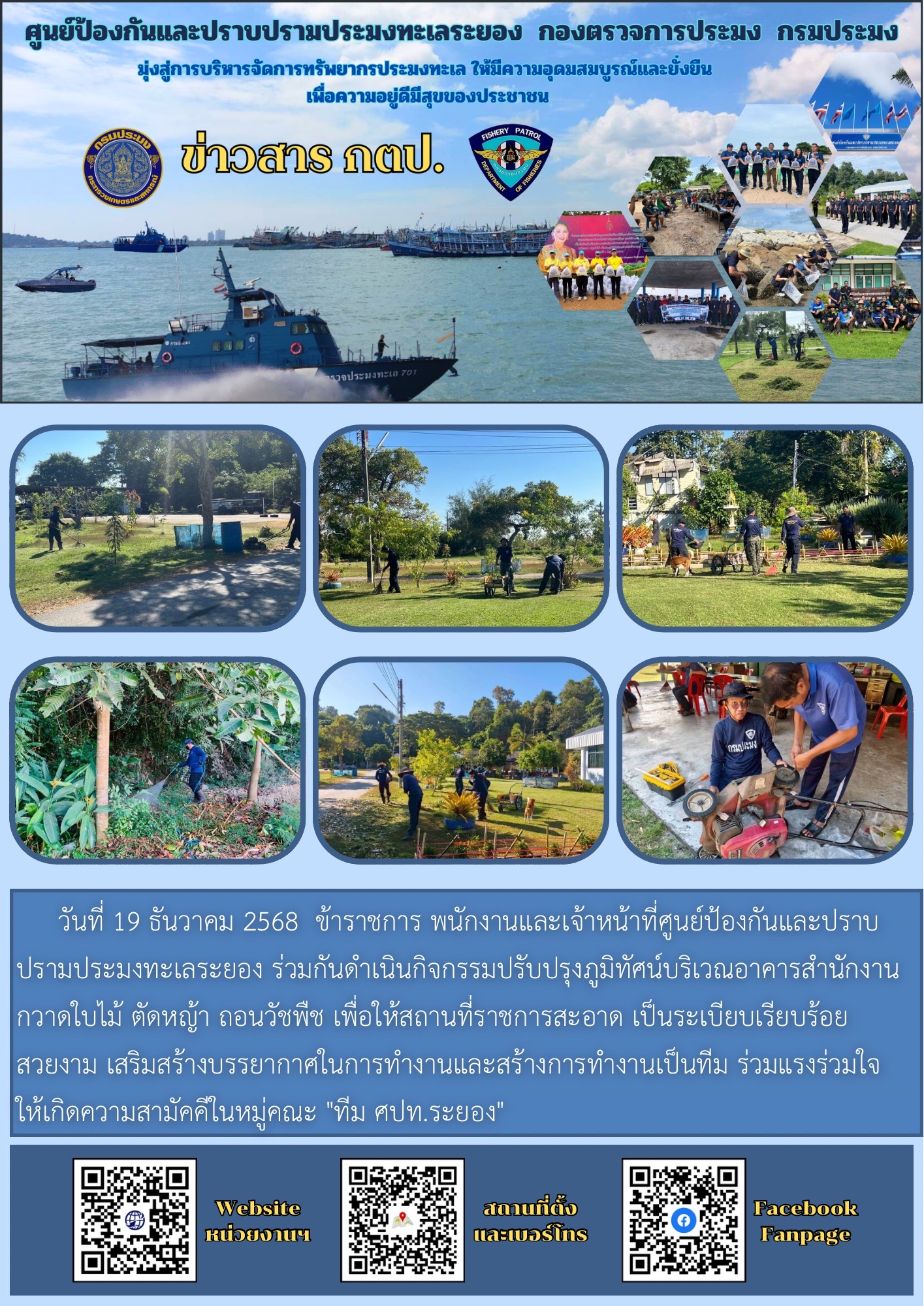 วันที่ 19 ธันวาคม 2568  ข้าราชการ พนักงานและเจ้าหน้าที่ศูนย์ป้องกันและปราบปรามประมงทะเลระยอง ร่วมกันดำเนินกิจกรรมปรับปรุงภูมิทัศน์บริเวณอาคารสำนักงาน กวาดใบไม้ ตัดหญ้า ถอนวัชพืช เพื่อให้สถานที่ราชการสะอาด เป็นระเบียบเรียบร้อย สวยงาม เสริมสร้างบรรยากาศในการทำงานและสร้างการทำงานเป็นทีม ร่วมแรงร่วมใจ ให้เกิดความสามัคคีในหมู่คณะ "ทีม ศปท.ระยอง"