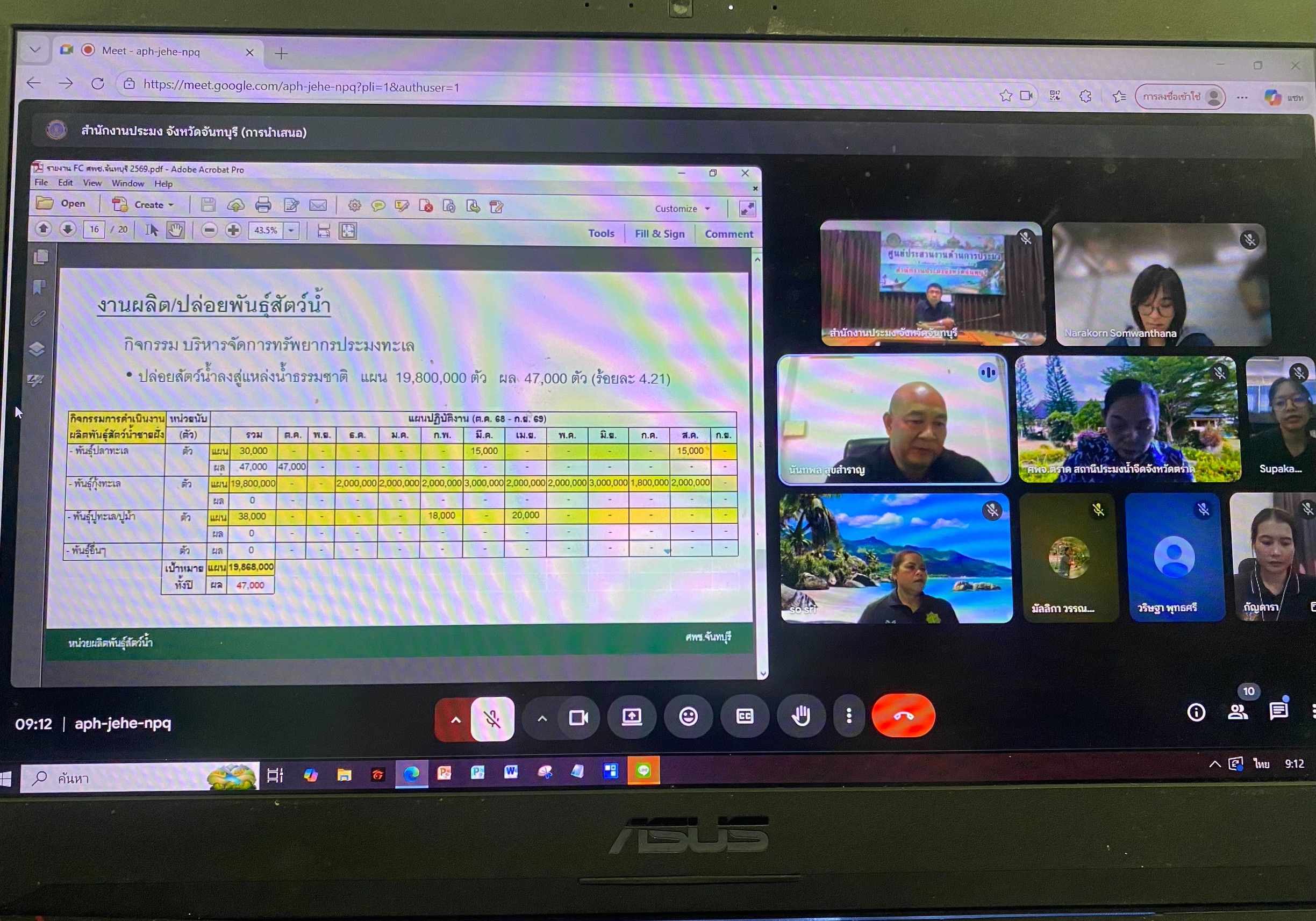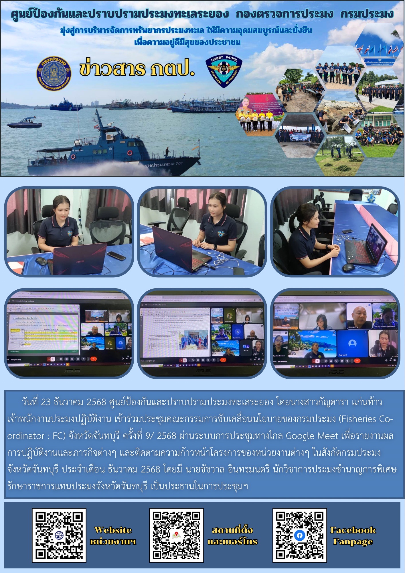 วันที่ 23 ธันวาคม 2568 ศูนย์ป้องกันและปราบปรามประมงทะเลระยอง โดยนางสาวกัญดารา แก่นท้าว เจ้าพนักงานประมงปฏิบัติงาน เข้าร่วมประชุมคณะกรรมการขับเคลื่อนนโยบายของกรมประมง (Fisheries Co-ordinator : FC) จังหวัดจันทบุรี ครั้งที่ 9/ 2568 ผ่านระบบการประชุมทางไกล Google Meet เพื่อรายงานผลการปฏิบัติงานและภารกิจต่างๆ และติดตามความก้าวหน้าโครงการของหน่วยงานต่างๆ ในสังกัดกรมประมงจังหวัดจันทบุรี ประจำเดือน ธันวาคม 2568 โดยมี นายชัชวาล อินทรมนตรี นักวิชาการประมงชำนาญการพิเศษ รักษาราชการแทนประมงจังหวัดจันทบุรี เป็นประธานในการประชุมฯ
