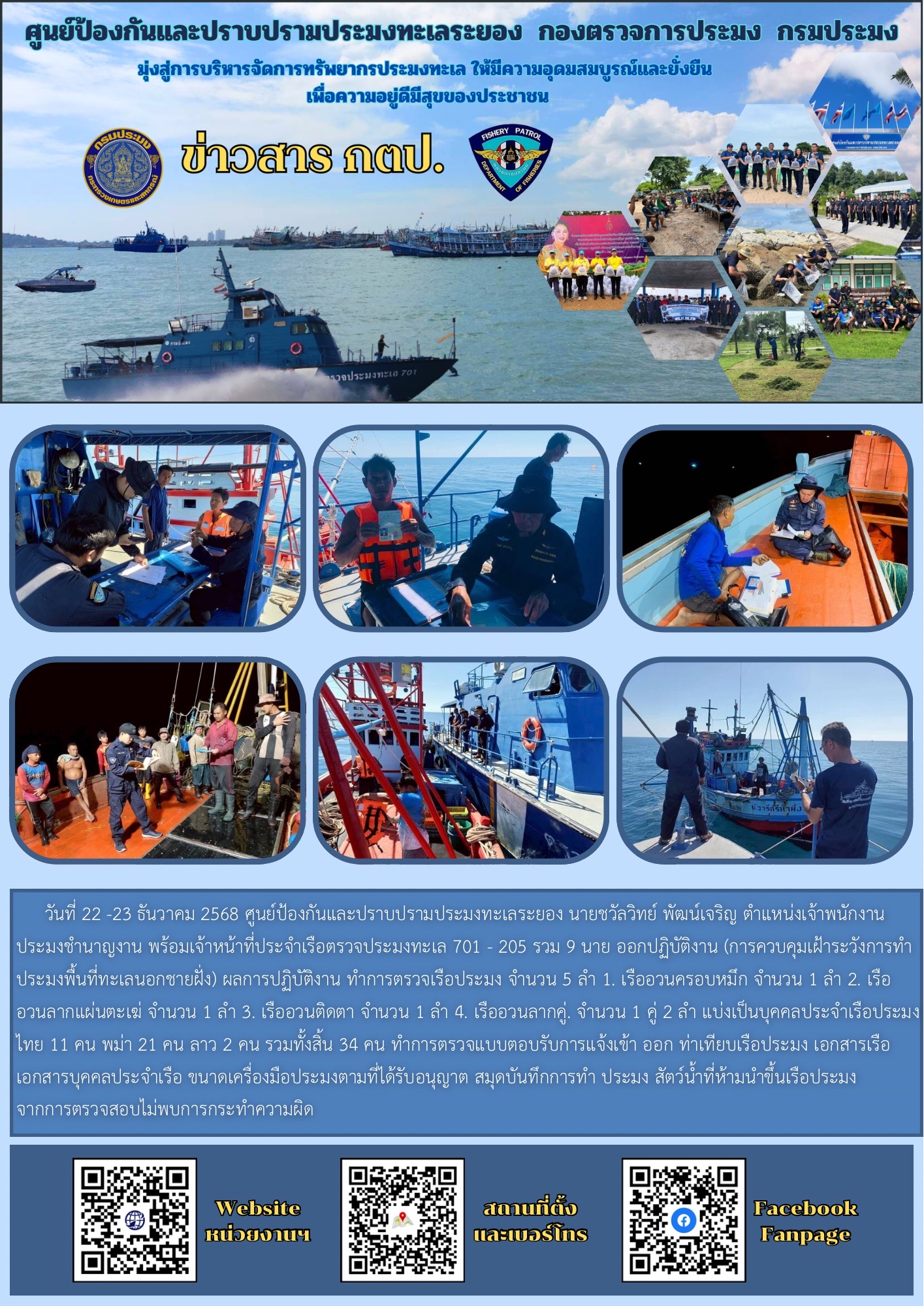 วันที่ 22 -23 ธันวาคม 2568    ศูนย์ป้องกันและปราบปรามประมงทะเลระยอง นายชวัลวิทย์ พัฒน์เจริญ ตำแหน่งเจ้าพนักงานประมงชำนาญงาน พร้อมเจ้าหน้าที่ประจำเรือตรวจประมงทะเล 701 - 205 รวม 9 นาย ออกปฏิบัติงาน (การควบคุมเฝ้าระวังการทำประมงพื้นที่ทะเลนอกชายฝั่ง) ผลการปฏิบัติงาน ทำการตรวจเรือประมง จำนวน 5 ลำ 1. เรืออวนครอบหมึก จำนวน 1 ลำ 2. เรืออวนลากแผ่นตะเฆ่ จำนวน 1 ลำ 3. เรืออวนติดตา จำนวน 1 ลำ 4. เรืออวนลากคู่. จำนวน 1 คู่ 2 ลำ แบ่งเป็นบุคคลประจำเรือประมงไทย 11 คน พม่า 21 คน ลาว 2 คน รวมทั้งสิ้น 34 คน ทำการตรวจแบบตอบรับการแจ้งเข้า ออก ท่าเทียบเรือประมง เอกสารเรือ เอกสารบุคคลประจำเรือ ขนาดเครื่องมือประมงตามที่ได้รับอนุญาต สมุดบันทึกการทำ ประมง สัตว์น้ำที่ห้ามนำขึ้นเรือประมง จากการตรวจสอบไม่พบการกระทำความผิด