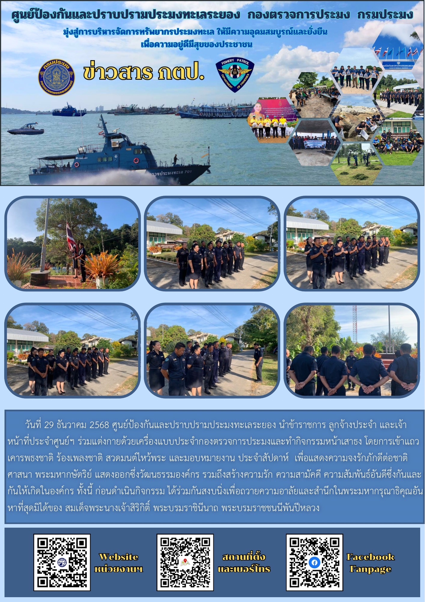 วันที่ 29 ธันวาคม 2568 ศูนย์ป้องกันและปราบปรามประมงทะเลระยอง นำข้าราชการ ลูกจ้างประจำ และเจ้าหน้าที่ประจำศูนย์ฯ ร่วมแต่งกายด้วยเครื่องแบบประจำกองตรวจการประมงและทำกิจกรรมหน้าเสาธง โดยการเข้าแถวเคารพธงชาติ ร้องเพลงชาติ สวดมนต์ไหว้พระ และมอบหมายงาน ประจำสัปดาห์  เพื่อแสดงความจงรักภักดีต่อชาติ ศาสนา พระมหากษัตริย์ แสดงออกซึ่งวัฒนธรรมองค์กร รวมถึงสร้างความรัก ความสามัคคี ความสัมพันธ์อันดีซึ่งกันและกันให้เกิดในองค์กร ทั้งนี้ ก่อนดำเนินกิจกรรม ได้ร่วมกันสงบนิ่งเพื่อถวายความอาลัยและสำนึกในพระมหากรุณาธิคุณอันหาที่สุดมิได้ของ สมเด็จพระนางเจ้าสิริกิติ์ พระบรมราชินีนาถ พระบรมราชชนนีพันปีหลวง