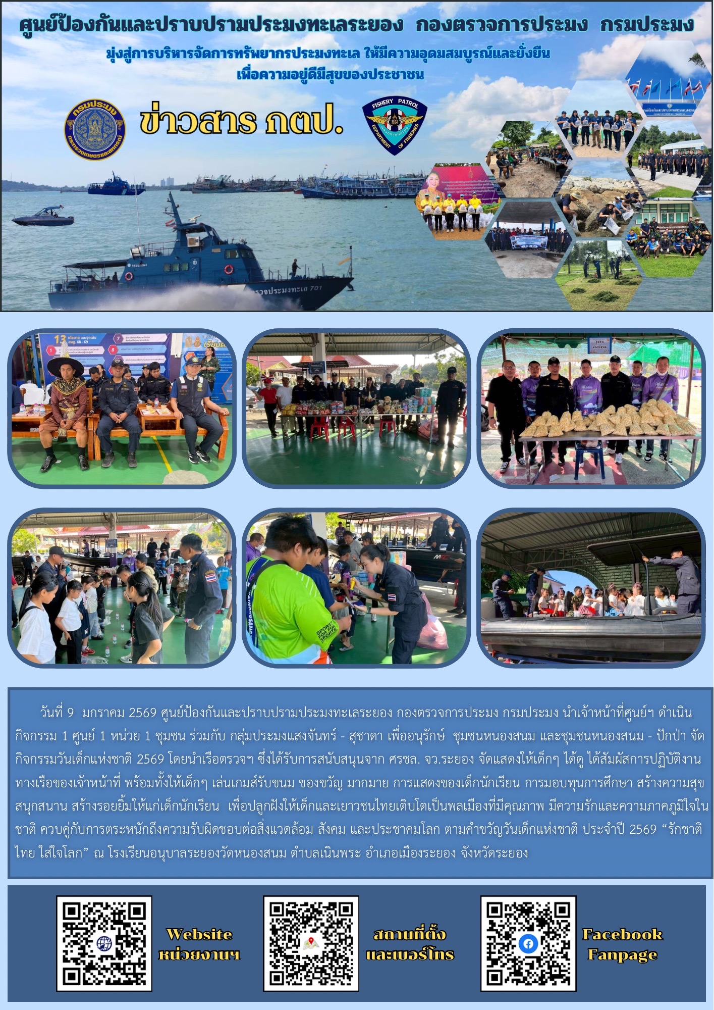 วันที่ 9  มกราคม 2569 ศูนย์ป้องกันและปราบปรามประมงทะเลระยอง กองตรวจการประมง กรมประมง นำเจ้าหน้าที่ศูนย์ฯ ดำเนินกิจกรรม 1 ศูนย์ 1 หน่วย 1 ชุมชน ร่วมกับ กลุ่มประมงแสงจันทร์ - สุชาดา เพื่ออนุรักษ์  ชุมชนหนองสนม และชุมชนหนองสนม - ปักป่า จัดกิจกรรมวันเด็กแห่งชาติ 2569 โดยนำเรือตรวจฯ ซึ่งได้รับการสนับสนุนจาก ศรชล. จว.ระยอง จัดแสดงให้เด็กๆ ได้ดู ได้สัมผัสการปฏิบัติงานทางเรือของเจ้าหน้าที่ พร้อมทั้งให้เด็กๆ เล่นเกมส์รับขนม ของขวัญ มากมาย การแสดงของเด็กนักเรียน การมอบทุนการศึกษา สร้างความสุข สนุกสนาน สร้างรอยยิ้มให้แก่เด็กนักเรียน  เพื่อปลูกฝังให้เด็กและเยาวชนไทยเติบโตเป็นพลเมืองที่มีคุณภาพ มีความรักและความภาคภูมิใจในชาติ ควบคู่กับการตระหนักถึงความรับผิดชอบต่อสิ่งแวดล้อม สังคม และประชาคมโลก ตามคำขวัญวันเด็กแห่งชาติ ประจำปี 2569 “รักชาติไทย ใส่ใจโลก” ณ โรงเรียนอนุบาลระยองวัดหนองสนม ตำบลเนินพระ อำเภอเมืองระยอง จังหวัดระยอง