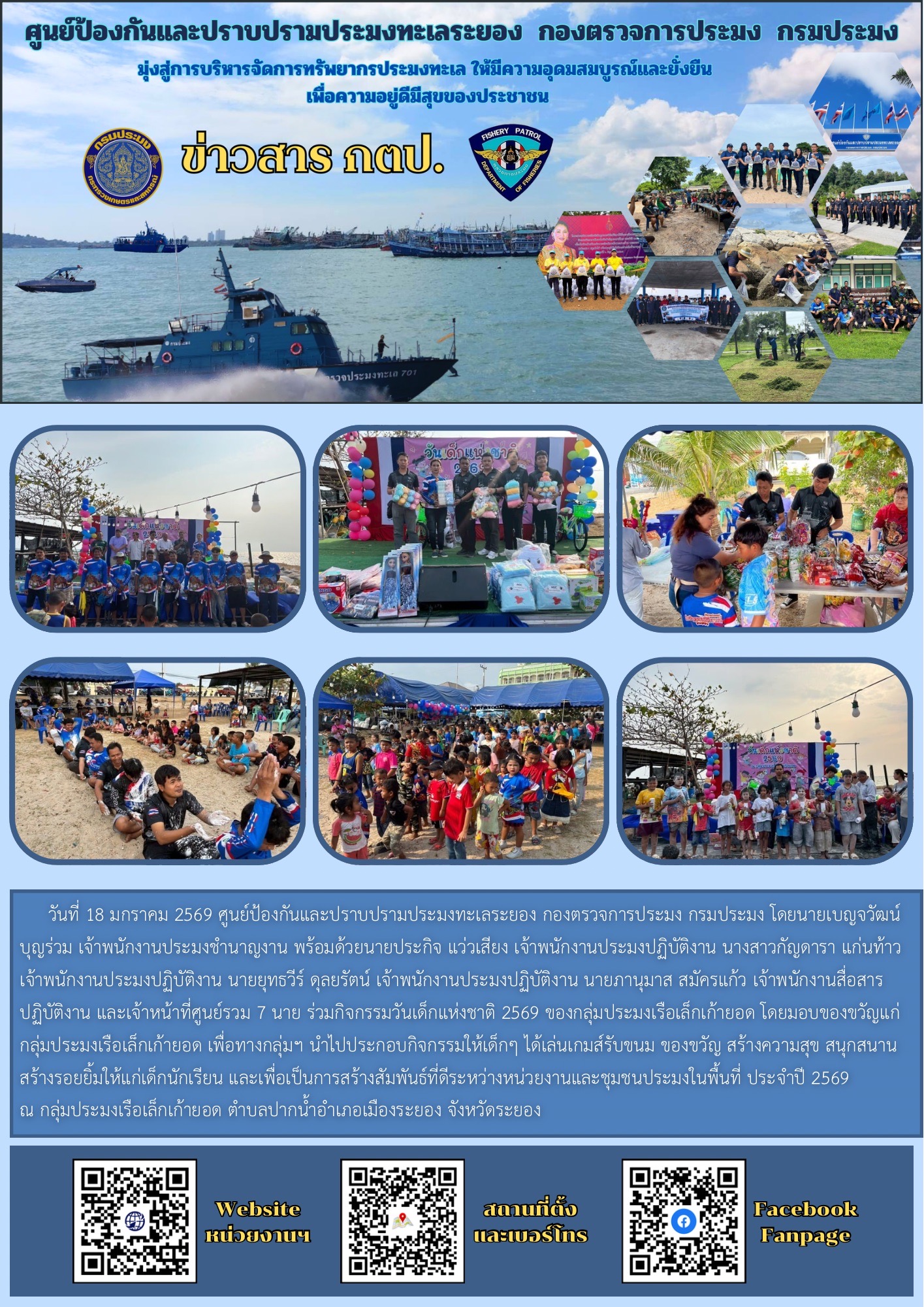 วันที่ 18 มกราคม 2569 ศูนย์ป้องกันและปราบปรามประมงทะเลระยอง กองตรวจการประมง กรมประมง โดยนายเบญจวัฒน์ บุญร่วม เจ้าพนักงานประมงชำนาญงาน พร้อมด้วยนายประกิจ แว่วเสียง เจ้าพนักงานประมงปฏิบัติงาน นางสาวกัญดารา แก่นท้าว เจ้าพนักงานประมงปฏิบัติงาน นายยุทธวีร์ ดุลยรัตน์ เจ้าพนักงานประมงปฏิบัติงาน นายภานุมาส สมัครแก้ว เจ้าพนักงานสื่อสารปฏิบัติงาน และเจ้าหน้าที่ศูนย์รวม 7 นาย ร่วมกิจกรรมวันเด็กแห่งชาติ 2569 ของกลุ่มประมงเรือเล็กเก้ายอด โดยมอบของขวัญแก่กลุ่มประมงเรือเล็กเก้ายอด เพื่อทางกลุ่มฯ นำไปประกอบกิจกรรมให้เด็กๆ ได้เล่นเกมส์รับขนม ของขวัญ สร้างความสุข สนุกสนาน สร้างรอยยิ้มให้แก่เด็กนักเรียน และเพื่อเป็นการสร้างสัมพันธ์ที่ดีระหว่างหน่วยงานและชุมชนประมงในพื้นที่ ประจำปี 2569  ณ กลุ่มประมงเรือเล็กเก้ายอด ตำบลปากน้ำอำเภอเมืองระยอง จังหวัดระยอง