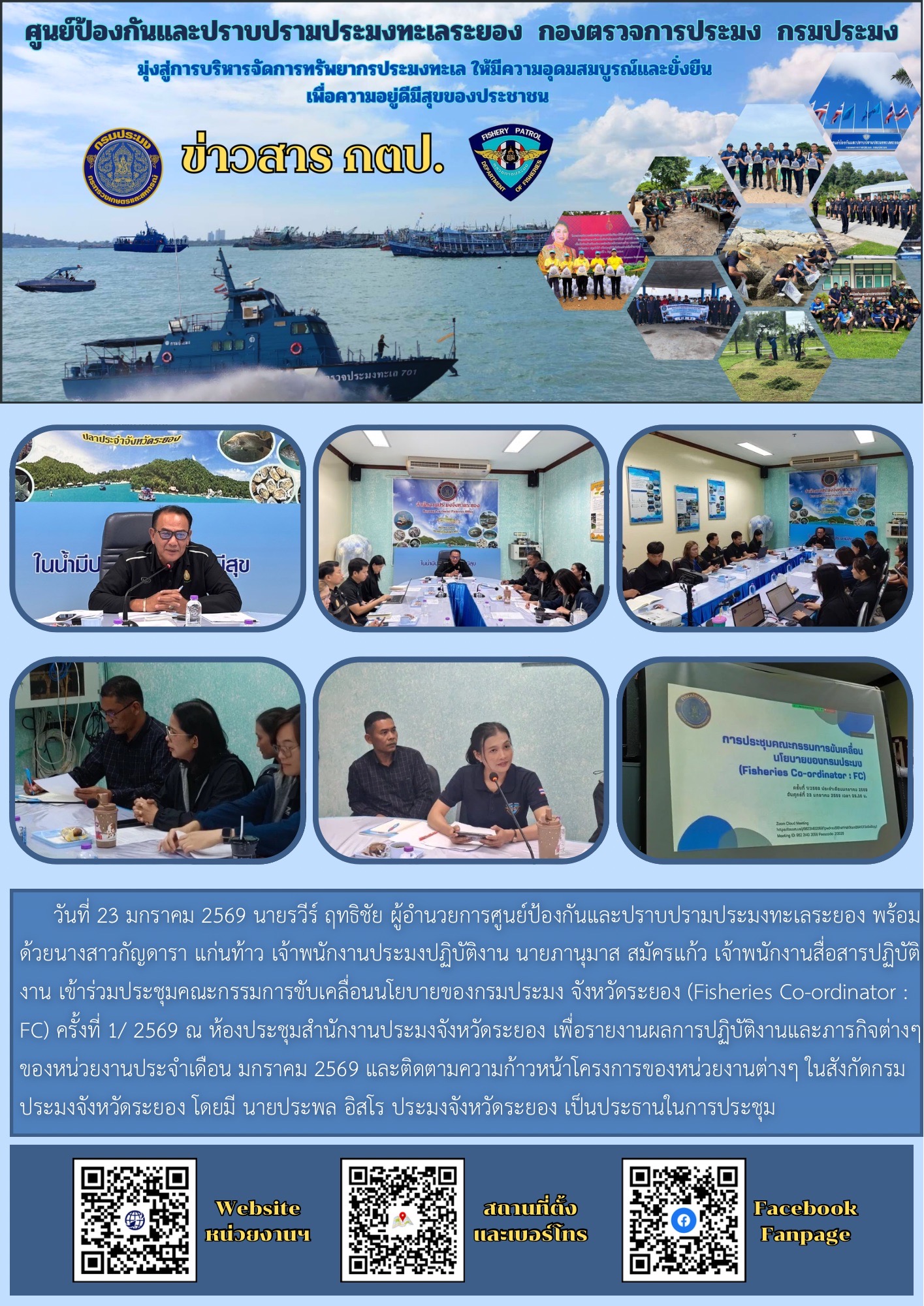 วันที่ 23 มกราคม 2569 นายรวีร์ ฤทธิชัย ผู้อำนวยการศูนย์ป้องกันและปราบปรามประมงทะเลระยอง พร้อมด้วยนางสาวกัญดารา แก่นท้าว เจ้าพนักงานประมงปฏิบัติงาน นายภานุมาส สมัครแก้ว เจ้าพนักงานสื่อสารปฏิบัติงาน เข้าร่วมประชุมคณะกรรมการขับเคลื่อนนโยบายของกรมประมง จังหวัดระยอง (Fisheries Co-ordinator : FC) ครั้งที่ 1/ 2569 ณ ห้องประชุมสำนักงานประมงจังหวัดระยอง เพื่อรายงานผลการปฏิบัติงานและภารกิจต่างๆ ของหน่วยงานประจำเดือน มกราคม 2569 และติดตามความก้าวหน้าโครงการของหน่วยงานต่างๆ ในสังกัดกรมประมงจังหวัดระยอง โดยมี นายประพล อิสโร ประมงจังหวัดระยอง เป็นประธานในการประชุม