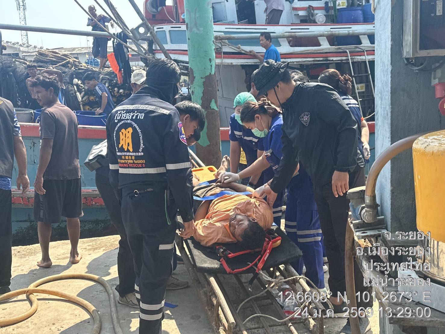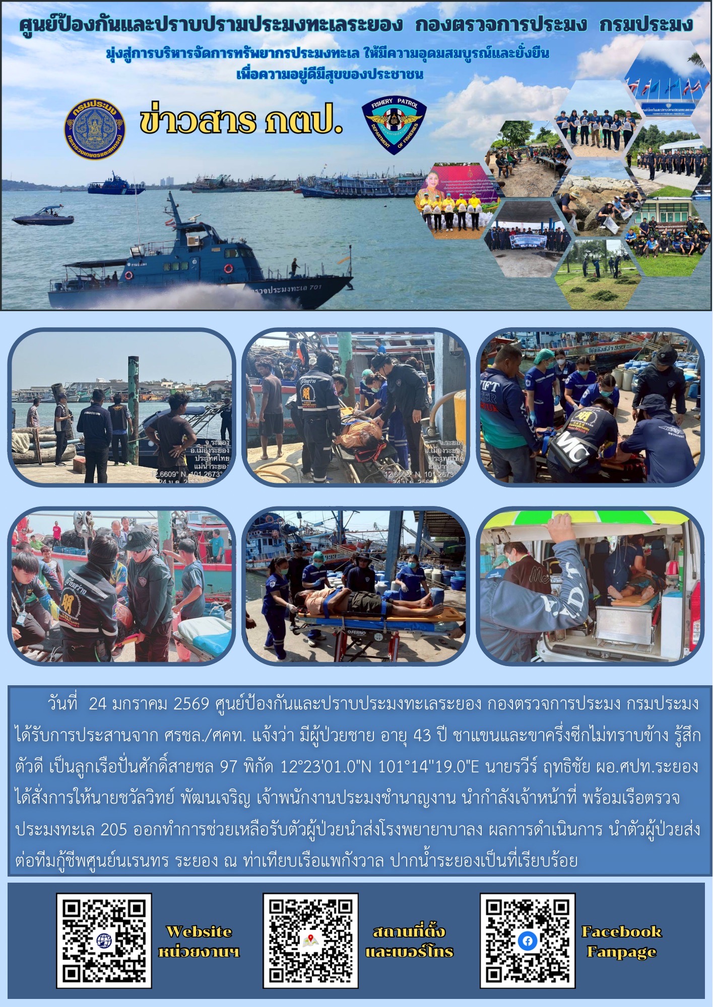 วันที่  24 มกราคม 2569 ศูนย์ป้องกันและปราบประมงทะเลระยอง กองตรวจการประมง กรมประมง ได้รับการประสานจาก ศรชล./ศคท. แจ้งว่า มีผู้ป่วยชาย อายุ 43 ปี ชาแขนและขาครึ่งซีกไม่ทราบข้าง รู้สึกตัวดี เป็นลูกเรือปั่นศักดิ์สายชล 97 พิกัด 12°23'01.0"N 101°14''19.0"E นายรวีร์ ฤทธิชัย ผอ.ศปท.ระยอง ได้สั่งการให้นายชวัลวิทย์ พัฒนเจริญ เจ้าพนักงานประมงชำนาญงาน นำกำลังเจ้าหน้าที่ พร้อมเรือตรวจประมงทะเล 205 ออกทำการช่วยเหลือรับตัวผู้ป่วยนำส่งโรงพยายาบาล ผลการดำเนินการ นำตัวผู้ป่วยส่งต่อทีมกู้ชีพศูนย์นเรนทร ระยอง ณ ท่าเทียบเรือแพกังวาล ปากน้ำระยองเป็นที่เรียบร้อย