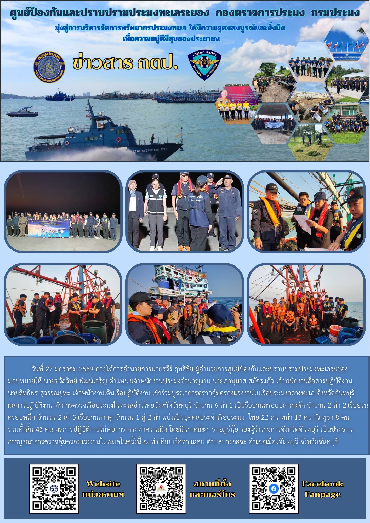 วันที่ 27 มกราคม 2569 ภายใต้การอำนวยการนายรวีร์ ฤทธิชัย ผู้อำนวยการศูนย์ป้องกันและปราบปรามประมงทะเลระยอง มอบหมายให้ นายชวัลวิทย์ พัฒน์เจริญ ตำแหน่งเจ้าพนักงานประมงชำนาญงาน นายภานุมาส สมัครแก้ว เจ้าพนักงานสื่อสารปฏิบัติงาน นายสิทธิพร สุวรรณยุหะ เจ้าพนักงานเดินเรือปฏิบัติงาน เข้าร่วมบูรณาการตรวจคุ้มครองแรงงานในเรือประมงกลางทะเล จังหวัดจันทบุรี ผลการปฏิบัติงาน ทำการตรวจเรือประมงในทะเลอ่าวไทยจังหวัดจันทบุรี จำนวน 6 ลำ 1.เรืออวนครอบปลากะตัก จำนวน 2 ลำ 2.เรืออวนครอบหมึก จำนวน 2 ลำ 3.เรืออวนลากคู่ จำนวน 1 คู่ 2 ลำ แบ่งเป็นบุคคลประจำเรือประมง  ไทย 22 คน พม่า 13 คน กัมพูชา 8 คน รวมทั้งสิ้น 43 คน ผลการปฏิบัติงานไม่พบการ กระทำความผิด โดยมีนางคณิตา ราษฎร์นุ้ย รองผู้ว่าราชการจังหวัดจันทบุรี เป็นประธานการบูรณาการตรวจคุ้มครองแรงงานในทะเลในครั้งนี้ ณ ท่าเทียบเรือท่าแฉลบ ตำบลบางกะจะ อำเภอเมืองจันทบุรี จังหวัดจันทบุรี