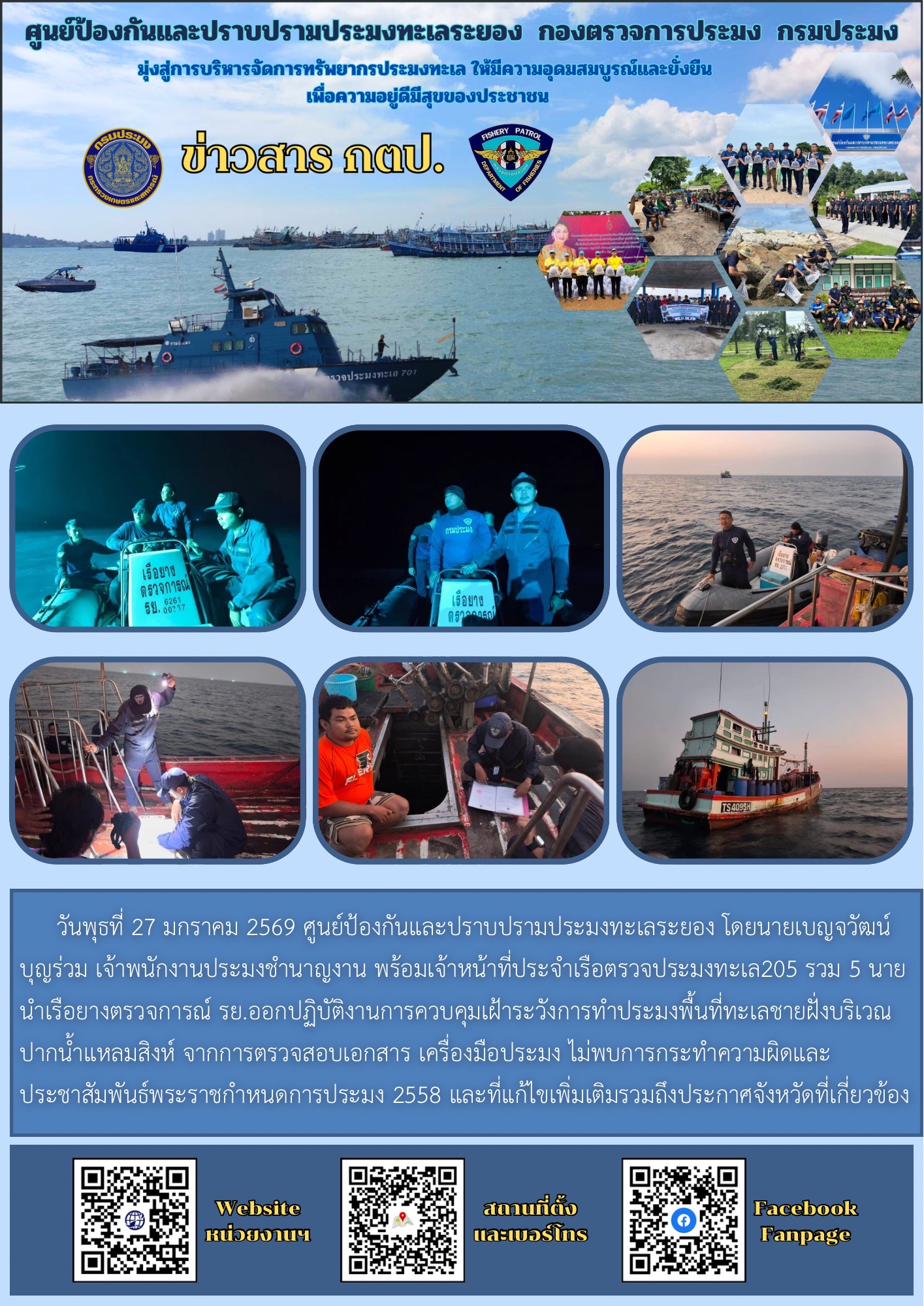 วันพุธที่ 27 มกราคม 2569 ศูนย์ป้องกันและปราบปรามประมงทะเลระยอง โดยนายเบญจวัฒน์ บุญร่วม เจ้าพนักงานประมงชำนาญงาน พร้อมเจ้าหน้าที่ประจำเรือตรวจประมงทะเล205 รวม 5 นาย นำเรือยางตรวจการณ์ รย.ออกปฏิบัติงานการควบคุมเฝ้าระวังการทำประมงพื้นที่ทะเลชายฝั่งบริเวณปากน้ำแหลมสิงห์ จากการตรวจสอบเอกสาร เครื่องมือประมง ไม่พบการกระทำความผิดและประชาสัมพันธ์พระราชกำหนดการประมง 2558 และที่แก้ไขเพิ่มเติมรวมถึงประกาศจังหวัดที่เกี่ยวข้อง