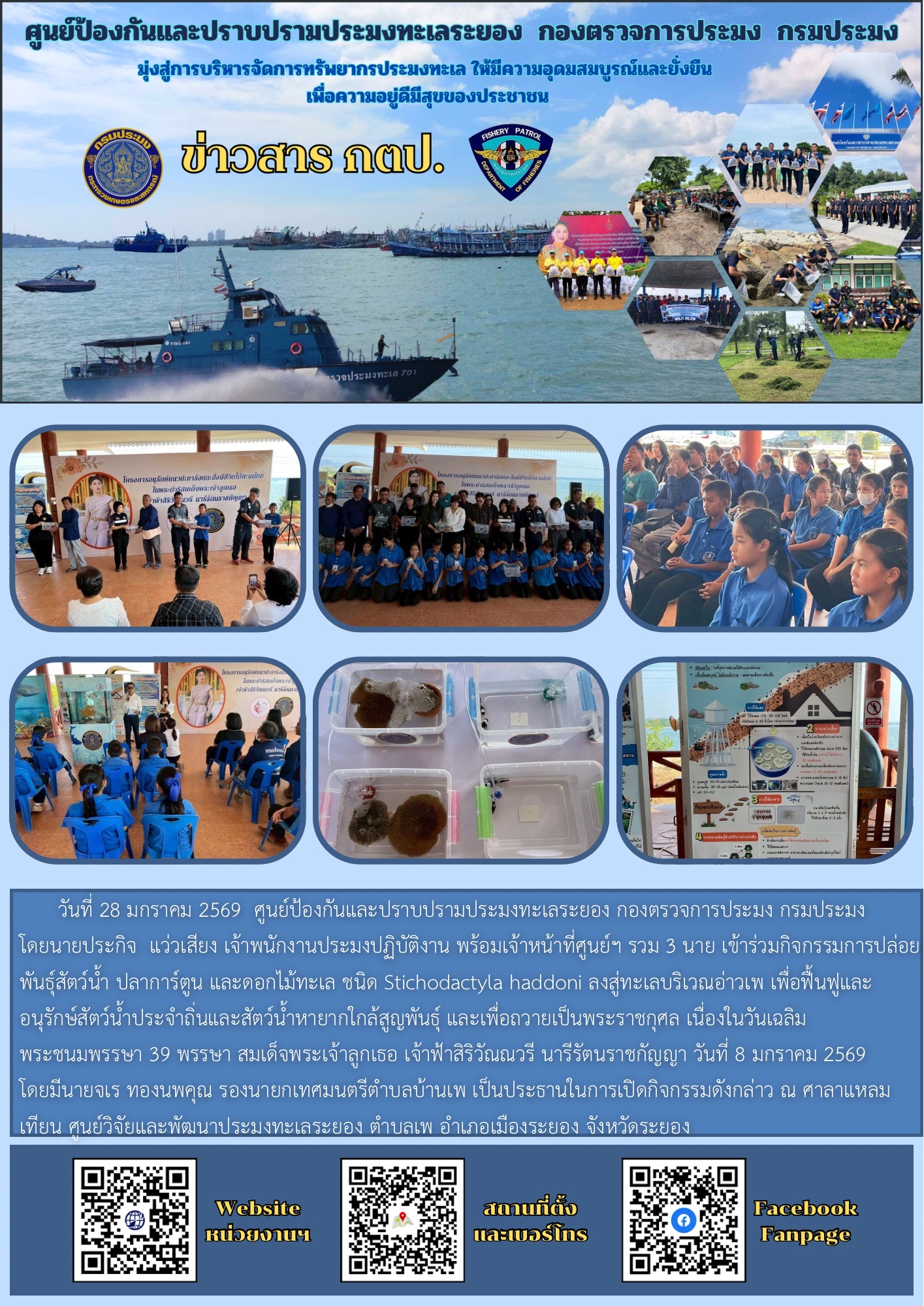 วันที่ 28 มกราคม 2569  ศูนย์ป้องกันและปราบปรามประมงทะเลระยอง กองตรวจการประมง กรมประมง โดยนายประกิจ  แว่วเสียง เจ้าพนักงานประมงปฏิบัติงาน พร้อมเจ้าหน้าที่ศูนย์ฯ รวม 3 นาย เข้าร่วมกิจกรรมการปล่อยพันธุ์สัตว์น้ำ ปลาการ์ตูน และดอกไม้ทะเล ชนิด Stichodactyla haddoni ลงสู่ทะเลบริเวณอ่าวเพ เพื่อฟื้นฟูและอนุรักษ์สัตว์น้ำประจำถิ่นและสัตว์น้ำหายากใกล้สูญพันธุ์ และเพื่อถวายเป็นพระราชกุศล เนื่องในวันเฉลิมพระชนมพรรษา 39 พรรษา สมเด็จพระเจ้าลูกเธอ เจ้าฟ้าสิริวัณณวรี นารีรัตนราชกัญญา วันที่ 8 มกราคม 2569 โดยมีนายจเร ทองนพคุณ รองนายกเทศมนตรีตำบลบ้านเพ เป็นประธานในการเปิดกิจกรรมดังกล่าว ณ ศาลาแหลมเทียน ศูนย์วิจัยและพัฒนาประมงทะเลระยอง ตำบลเพ อำเภอเมืองระยอง จังหวัดระยอง