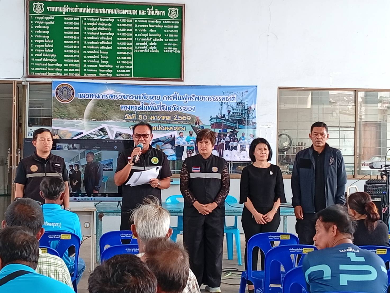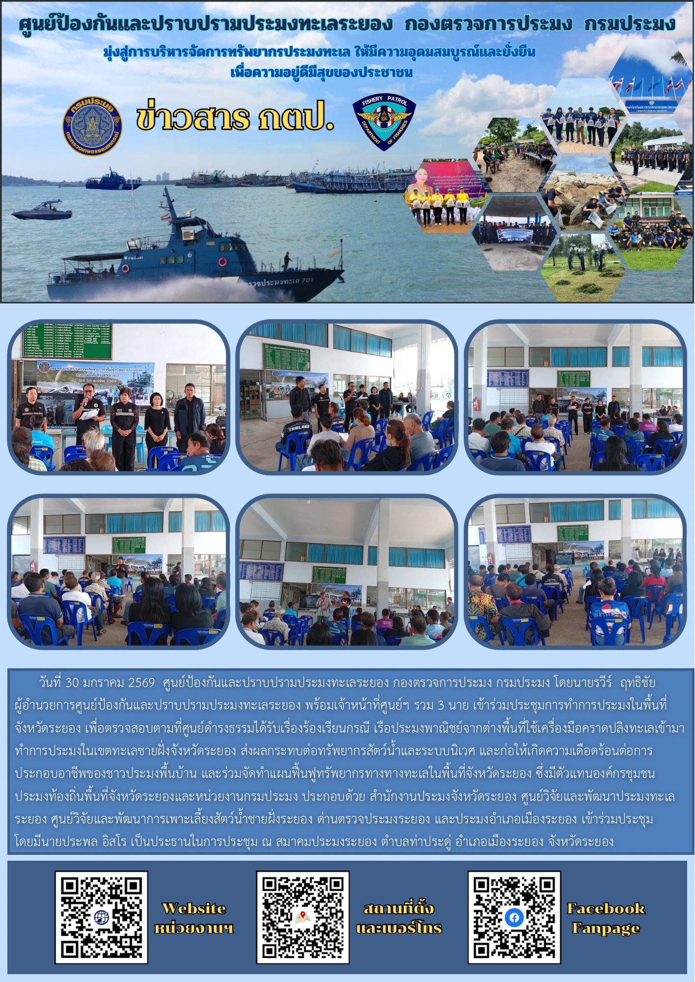 วันที่ 30 มกราคม 2569  ศูนย์ป้องกันและปราบปรามประมงทะเลระยอง กองตรวจการประมง กรมประมง โดยนายรวีร์  ฤทธิชัย ผู้อำนวยการศูนย์ป้องกันและปราบปรามประมงทะเลระยอง พร้อมเจ้าหน้าที่ศูนย์ฯ รวม 3 นาย เข้าร่วมประชุมการทำการประมงในพื้นที่จังหวัดระยอง เพื่อตรวจสอบตามที่ศูนย์ดำรงธรรมได้รับเรื่องร้องเรียนกรณี เรือประมงพาณิชย์จากต่างพื้นที่ใช้เครื่องมือคราดปลิงทะเลเข้ามาทำการประมงในเขตทะเลชายฝั่งจังหวัดระยอง ส่งผลกระทบต่อทรัพยากรสัตว์น้ำและระบบนิเวศ และก่อให้เกิดความเดือดร้อนต่อการประกอบอาชีพของชาวประมงพื้นบ้าน และร่วมจัดทำแผนฟื้นฟูทรัพยากรทางทางทะเลในพื้นที่จังหวัดระยอง ซึ่งมีตัวแทนองค์กรชุมชนประมงท้องถิ่นพื้นที่จังหวัดระยองและหน่วยงานกรมประมง ประกอบด้วย สำนักงานประมงจังหวัดระยอง ศูนย์วิจัยและพัฒนาประมงทะเลระยอง ศูนย์วิจัยและพัฒนาการเพาะเลี้ยงสัตว์น้ำชายฝั่งระยอง ด่านตรวจประมงระยอง และประมงอำเภอเมืองระยอง เข้าร่วมประชุม โดยมีนายประพล อิสโร เป็นประธานในการประชุม ณ สมาคมประมงระยอง ตำบลท่าประดู่ อำเภอเมืองระยอง จังหวัดระยอง