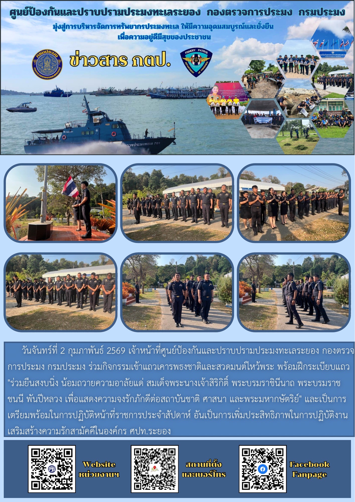วันจันทร์ที่ 2 กุมภาพันธ์ 2569 เจ้าหน้าที่ศูนย์ป้องกันและปราบปรามประมงทะเลระยอง กองตรวจการประมง กรมประมง ร่วมกิจกรรมเข้าแถวเคารพธงชาติและสวดมนต์ไหว้พระ พร้อมฝึกระเบียบแถว "ร่วมยืนสงบนิ่ง น้อมถวายความอาลัยแด่ สมเด็จพระนางเจ้าสิริกิติ์ พระบรมราชินีนาถ พระบรมราชชนนี พันปีหลวง เพื่อแสดงความจงรักภักดีต่อสถาบันชาติ ศาสนา และพระมหากษัตริย์" และเป็นการเตรียมพร้อมในการปฏิบัติหน้าที่ราชการประจำสัปดาห์ อันเป็นการเพิ่มประสิทธิภาพในการปฏิบัติงาน เสริมสร้างความรักสามัคคีในองค์กร ศปท.ระยอง