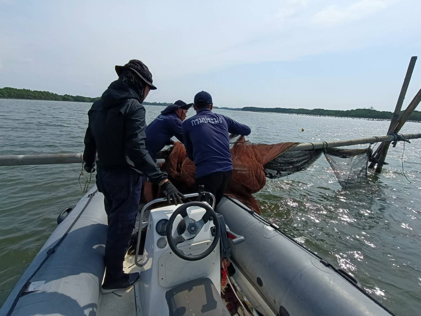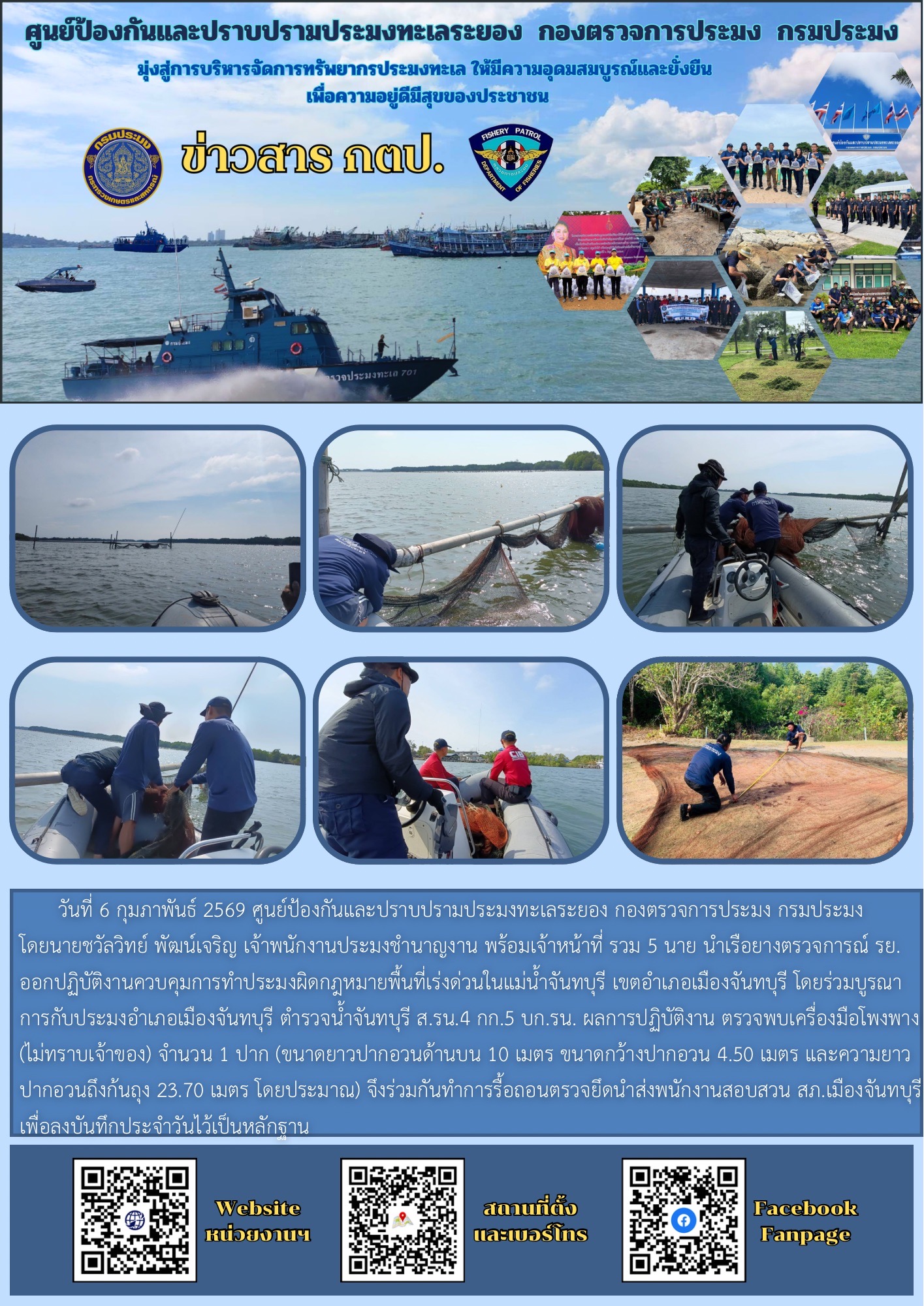 วันที่ 6 กุมภาพันธ์ 2569 ศูนย์ป้องกันและปราบปรามประมงทะเลระยอง กองตรวจการประมง กรมประมง โดยนายชวัลวิทย์ พัฒน์เจริญ เจ้าพนักงานประมงชำนาญงาน พร้อมเจ้าหน้าที่ รวม 5 นาย นำเรือยางตรวจการณ์ รย. ออกปฏิบัติงานควบคุมการทำประมงผิดกฎหมายพื้นที่เร่งด่วนในแม่น้ำจันทบุรี เขตอำเภอเมืองจันทบุรี โดยร่วมบูรณาการกับประมงอำเภอเมืองจันทบุรี ตำรวจน้ำจันทบุรี ส.รน.4 กก.5 บก.รน.ผลการปฏิบัติงาน ตรวจพบเครื่องมือโพงพาง (ไม่ทราบเจ้าของ) จำนวน 1 ปาก (ขนาดยาวปากอวนด้านบน 10 เมตร ขนาดกว้างปากอวน 4.50 เมตร และความยาวปากอวนถึงก้นถุง 23.70 เมตร โดยประมาณ) จึงร่วมกันทำการรื้อถอนตรวจยึดนำส่งพนักงานสอบสวน สภ.เมืองจันทบุรี เพื่อลงบันทึกประจำวันไว้เป็นหลักฐาน