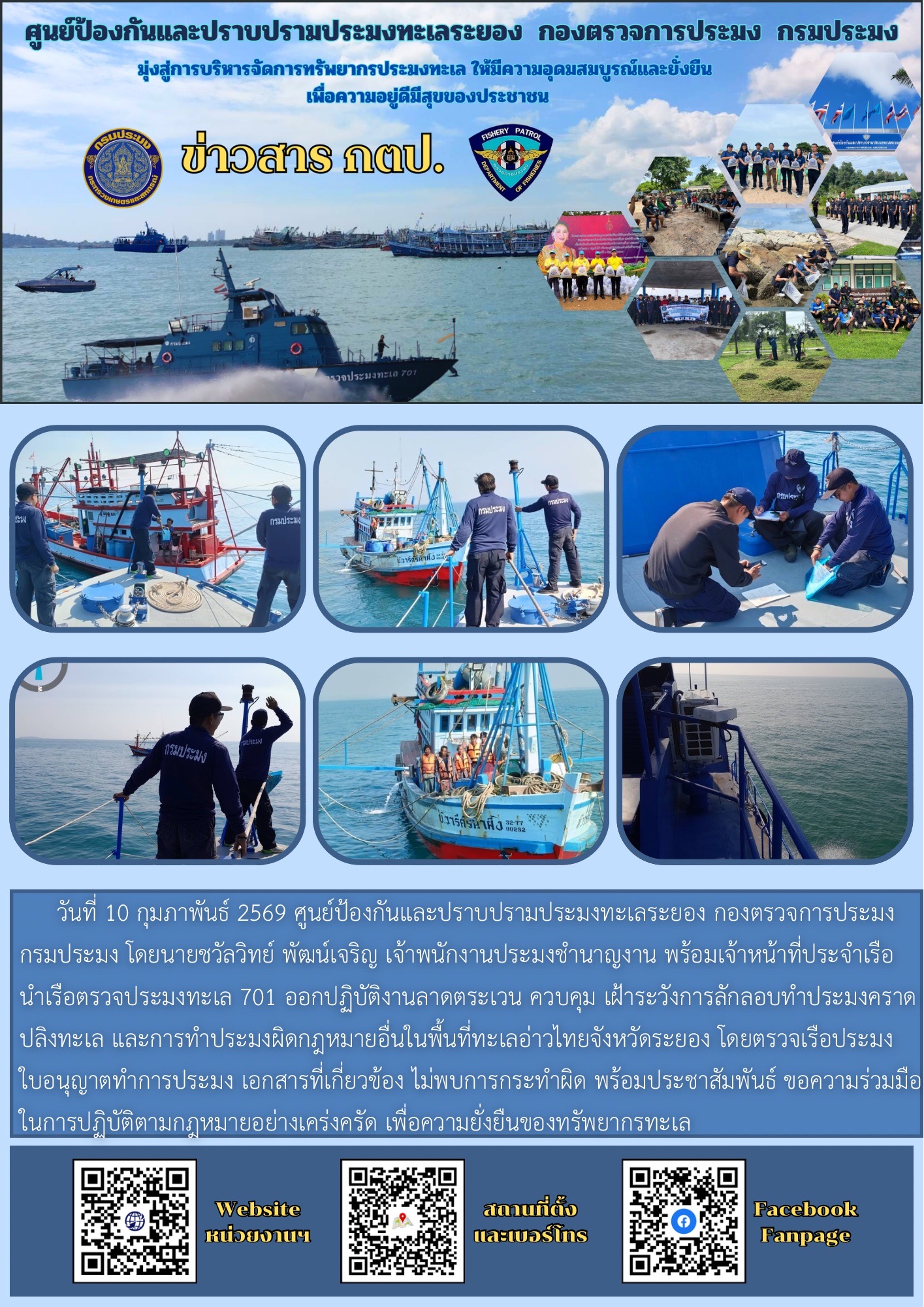 วันที่ 10 กุมภาพันธ์ 2569 ศูนย์ป้องกันและปราบปรามประมงทะเลระยอง กองตรวจการประมง กรมประมง โดยนายชวัลวิทย์ พัฒน์เจริญ เจ้าพนักงานประมงชำนาญงาน พร้อมเจ้าหน้าที่ประจำเรือ นำเรือตรวจประมงทะเล 701 ออกปฏิบัติงานลาดตระเวน ควบคุม เฝ้าระวังการลักลอบทำประมงคราดปลิงทะเล และการทำประมงผิดกฎหมายอื่นในพื้นที่ทะเลอ่าวไทยจังหวัดระยอง โดยตรวจเรือประมง ใบอนุญาตทำการประมง เอกสารที่เกี่ยวข้อง ไม่พบการกระทำผิด พร้อมประชาสัมพันธ์ ขอความร่วมมือในการปฏิบัติตามกฎหมายอย่างเคร่งครัด เพื่อความยั่งยืนของทรัพยากรทะเล