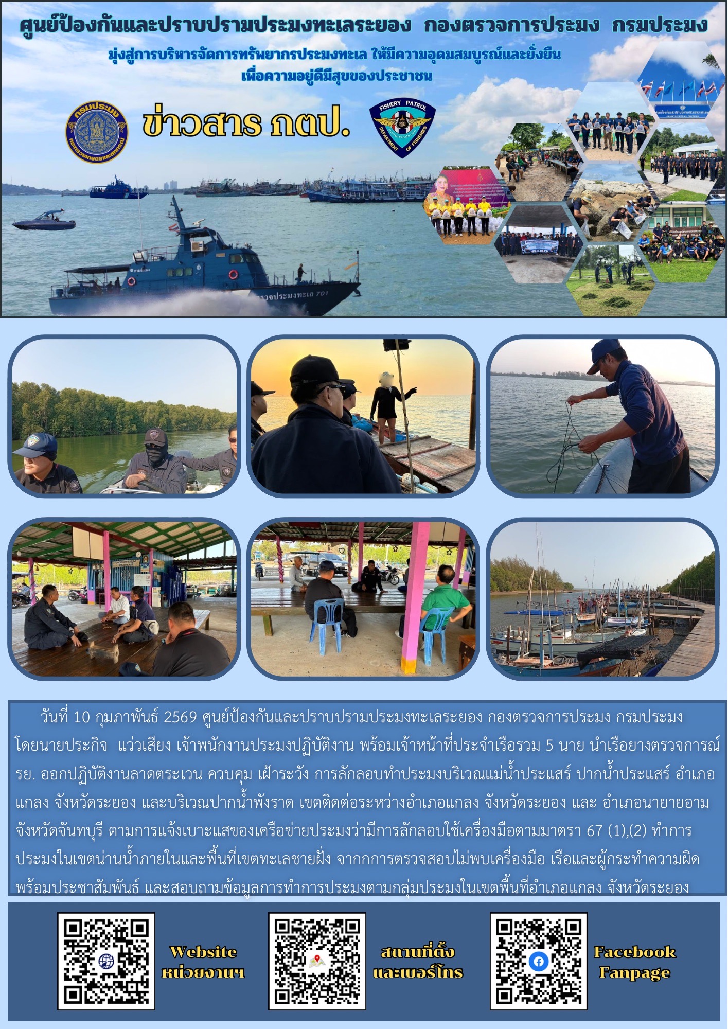 วันที่ 10 กุมภาพันธ์ 2569 ศูนย์ป้องกันและปราบปรามประมงทะเลระยอง กองตรวจการประมง กรมประมง โดยนายประกิจ  แว่วเสียง เจ้าพนักงานประมงปฏิบัติงาน พร้อมเจ้าหน้าที่ประจำเรือรวม 5 นาย นำเรือยางตรวจการณ์ รย. ออกปฏิบัติงานลาดตระเวน ควบคุม เฝ้าระวัง การลักลอบทำประมงบริเวณแม่น้ำประแสร์ ปากน้ำประแสร์ อำเภอแกลง จังหวัดระยอง และบริเวณปากน้ำพังราด เขตติดต่อระหว่างอำเภอแกลง จังหวัดระยอง และ อำเภอนายายอาม จังหวัดจันทบุรี ตามการแจ้งเบาะแสของเครือข่ายประมงว่ามีการลักลอบใช้เครื่องมือตามมาตรา 67 (1),(2) ทำการประมงในเขตน่านน้ำภายในและพื้นที่เขตทะเลชายฝั่ง จากกการตรวจสอบไม่พบเครื่องมือ เรือและผู้กระทำความผิด  พร้อมประชาสัมพันธ์ และสอบถามข้อมูลการทำการประมงตามกลุ่มประมงในเขตพื้นที่อำเภอแกลง จังหวัดระยอง