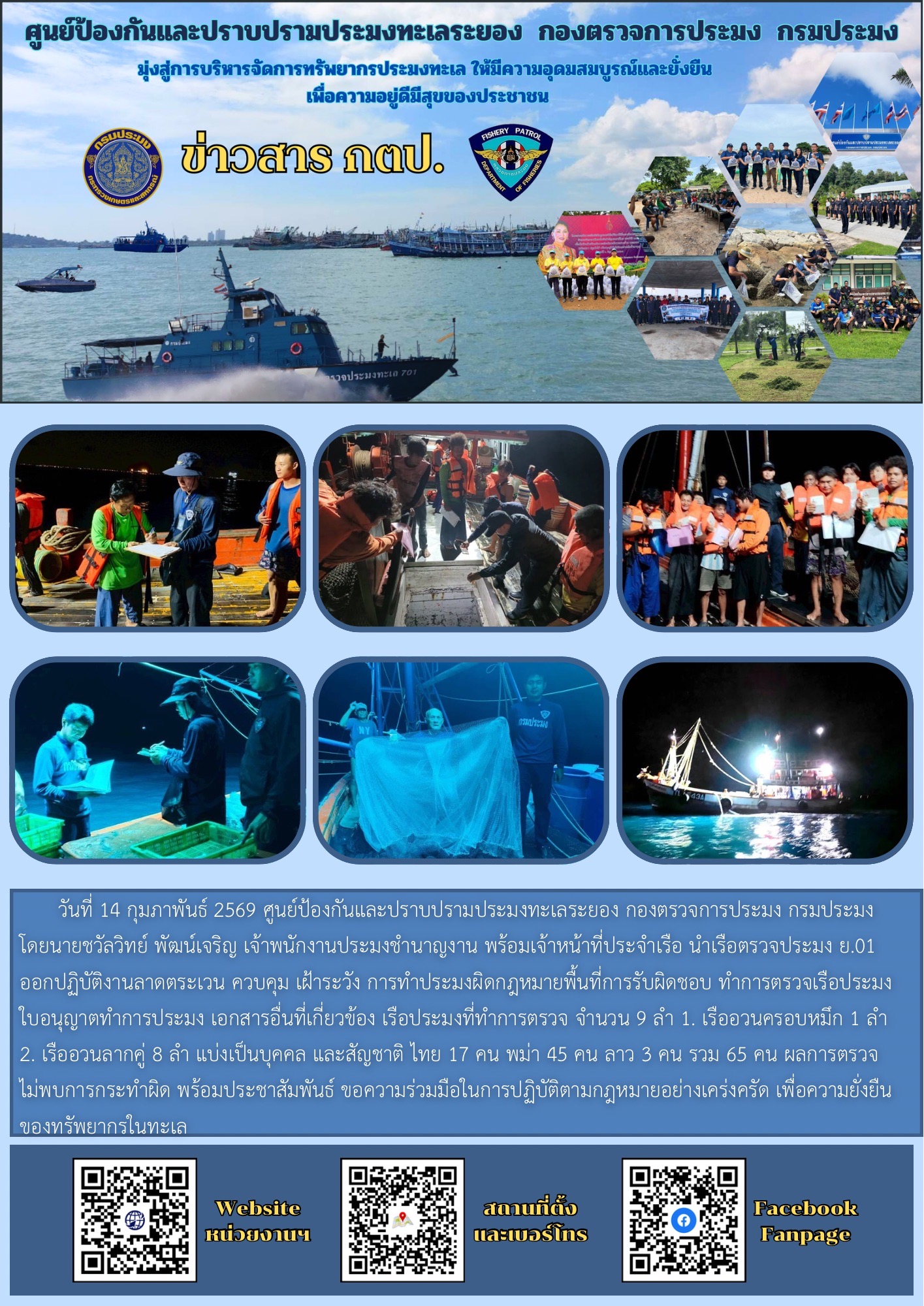 วันที่ 14 กุมภาพันธ์ 2569 ศูนย์ป้องกันและปราบปรามประมงทะเลระยอง กองตรวจการประมง กรมประมง โดยนายชวัลวิทย์ พัฒน์เจริญ เจ้าพนักงานประมงชำนาญงาน พร้อมเจ้าหน้าที่ประจำเรือ นำเรือตรวจประมง ย.01 ออกปฏิบัติงานลาดตระเวน ควบคุม เฝ้าระวัง การทำประมงผิดกฎหมายพื้นที่การรับผิดชอบ ทำการตรวจเรือประมง ใบอนุญาตทำการประมง เอกสารอื่นที่เกี่ยวข้อง เรือประมงที่ทำการตรวจ จำนวน 9 ลำ 1. เรืออวนครอบหมึก 1 ลำ 2. เรืออวนลากคู่ 8 ลำ แบ่งเป็นบุคคล และสัญชาติ ไทย 17 คน พม่า 45 คน ลาว    3 คน รวม 65 คน ผลการตรวจไม่พบการกระทำผิด พร้อมประชาสัมพันธ์ ขอความร่วมมือในการปฏิบัติตามกฎหมายอย่างเคร่งครัด เพื่อความยั่งยืนของทรัพยากรในทะเล
