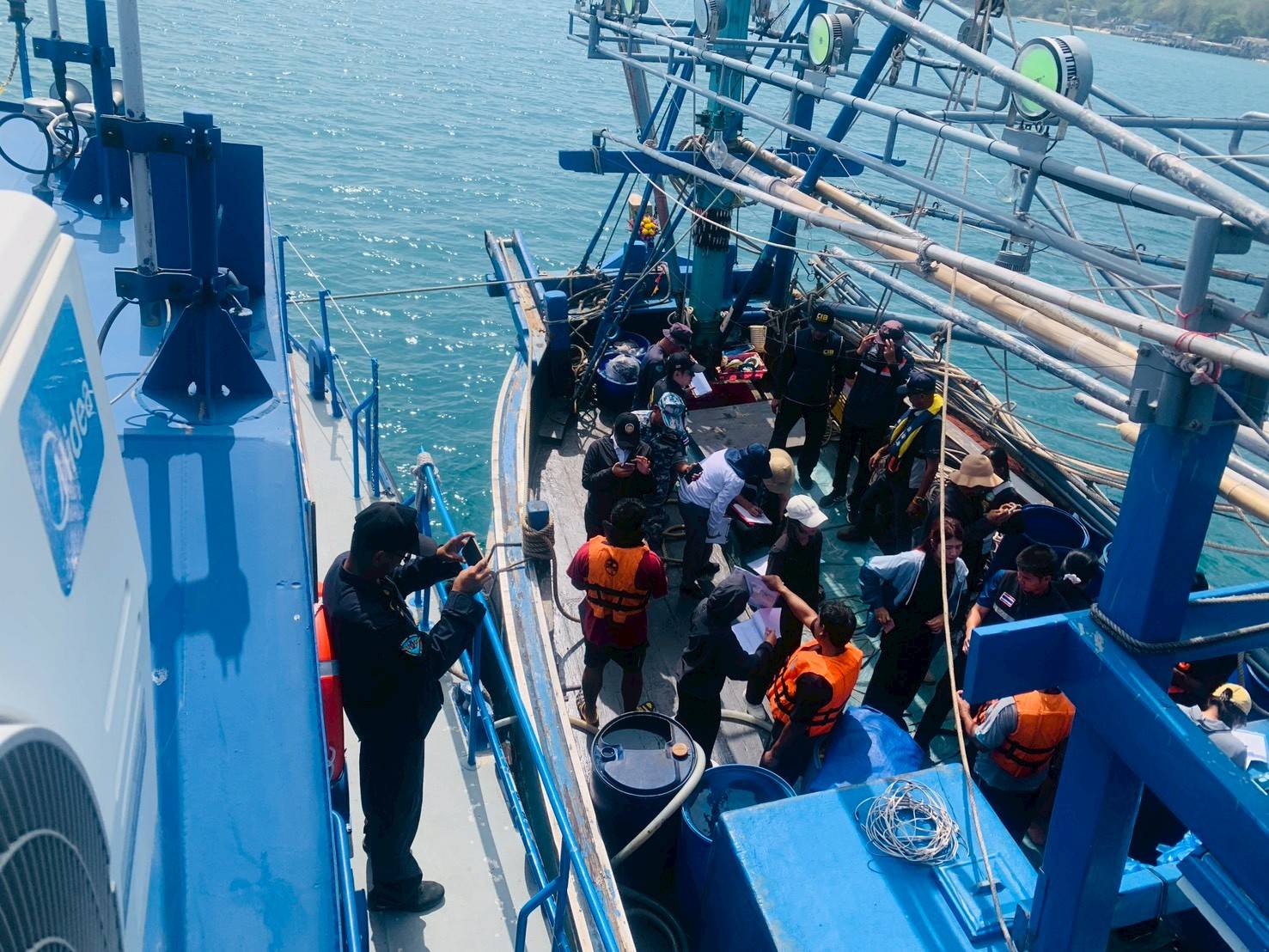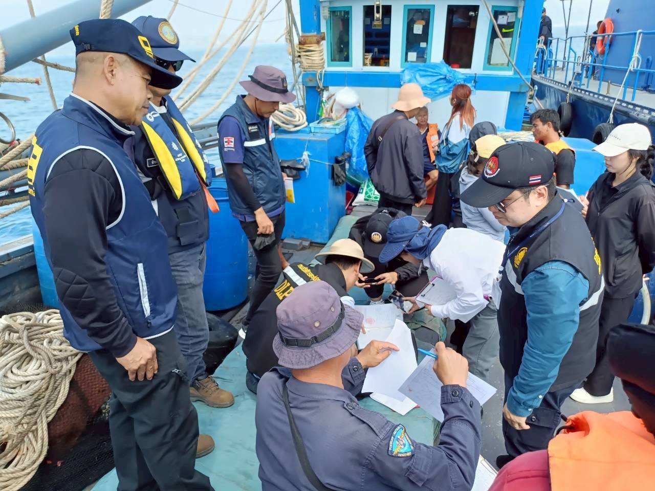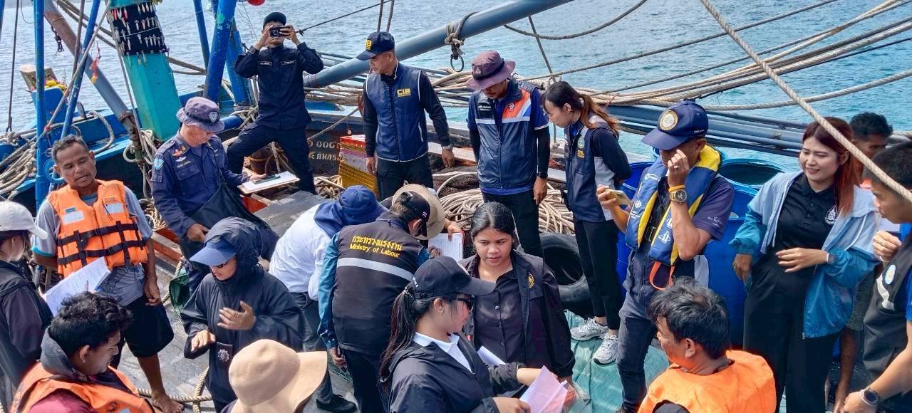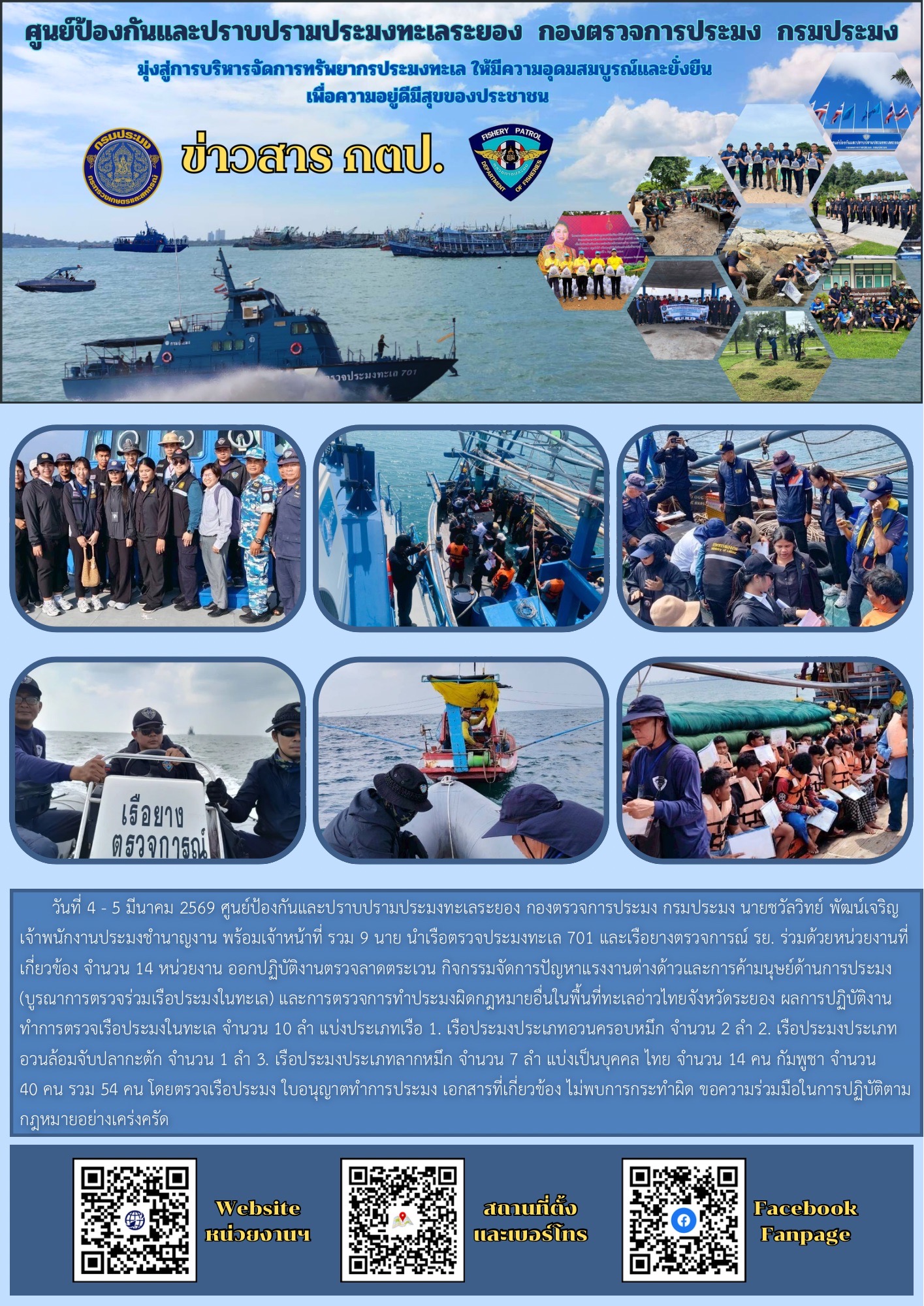 วันที่ 4 - 5 มีนาคม 2569 ศูนย์ป้องกันและปราบปรามประมงทะเลระยอง กองตรวจการประมง กรมประมง นายชวัลวิทย์ พัฒน์เจริญ เจ้าพนักงานประมงชำนาญงาน พร้อมเจ้าหน้าที่ รวม 9 นาย นำเรือตรวจประมงทะเล 701 และเรือยางตรวจการณ์ รย. ร่วมด้วยหน่วยงานที่เกี่ยวข้อง จำนวน 14 หน่วยงาน ออกปฏิบัติงานตรวจลาดตระเวน กิจกรรมจัดการปัญหาแรงงานต่างด้าวและการค้ามนุษย์ด้านการประมง (บูรณาการตรวจร่วมเรือประมงในทะเล) และการตรวจการทำประมงผิดกฎหมายอื่นในพื้นที่ทะเลอ่าวไทยจังหวัดระยอง ผลการปฏิบัติงาน ทำการตรวจเรือประมงในทะเล จำนวน 10 ลำ แบ่งประเภทเรือ 1. เรือประมงประเภทอวนครอบหมึก จำนวน 2 ลำ 2. เรือประมงประเภทอวนล้อมจับปลากะตัก จำนวน 1 ลำ 3. เรือประมงประเภทลากหมึก จำนวน 7 ลำ แบ่งเป็นบุคคล ไทย จำนวน 14 คน กัมพูชา จำนวน 40 คน รวม 54 คน โดยตรวจเรือประมง ใบอนุญาตทำการประมง เอกสารที่เกี่ยวข้อง ไม่พบการกระทำผิด ขอความร่วมมือในการปฏิบัติตามกฎหมายอย่างเคร่งครัด