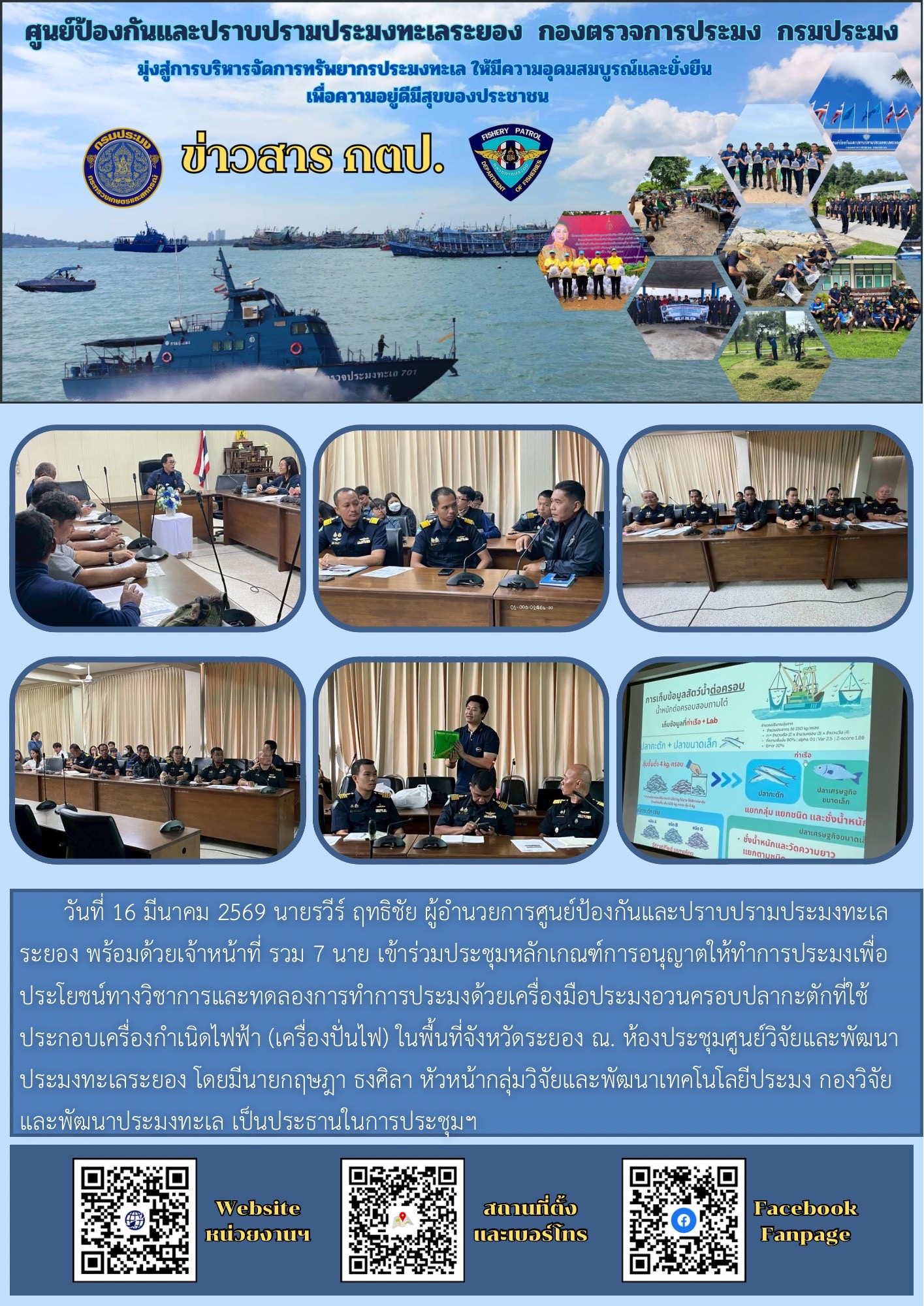 วันที่ 16 มีนาคม 2569 นายรวีร์ ฤทธิชัย ผู้อำนวยการศูนย์ป้องกันและปราบปรามประมงทะเลระยอง พร้อมด้วยเจ้าหน้าที่ รวม 7 นาย เข้าร่วมประชุมหลักเกณฑ์การอนุญาตให้ทำการประมงเพื่อประโยชน์ทางวิชาการและทดลองการทำการประมงด้วยเครื่องมือประมงอวนครอบปลากะตักที่ใช้ประกอบเครื่องกำเนิดไฟฟ้า (เครื่องปั่นไฟ) ในพื้นที่จังหวัดระยอง ณ. ห้องประชุมศูนย์วิจัยและพัฒนาประมงทะเลระยอง โดยมีนายกฤษฎา ธงศิลา หัวหน้ากลุ่มวิจัยและพัฒนาเทคโนโลยีประมง กองวิจัยและพัฒนาประมงทะเล เป็นประธานในการประชุมฯ