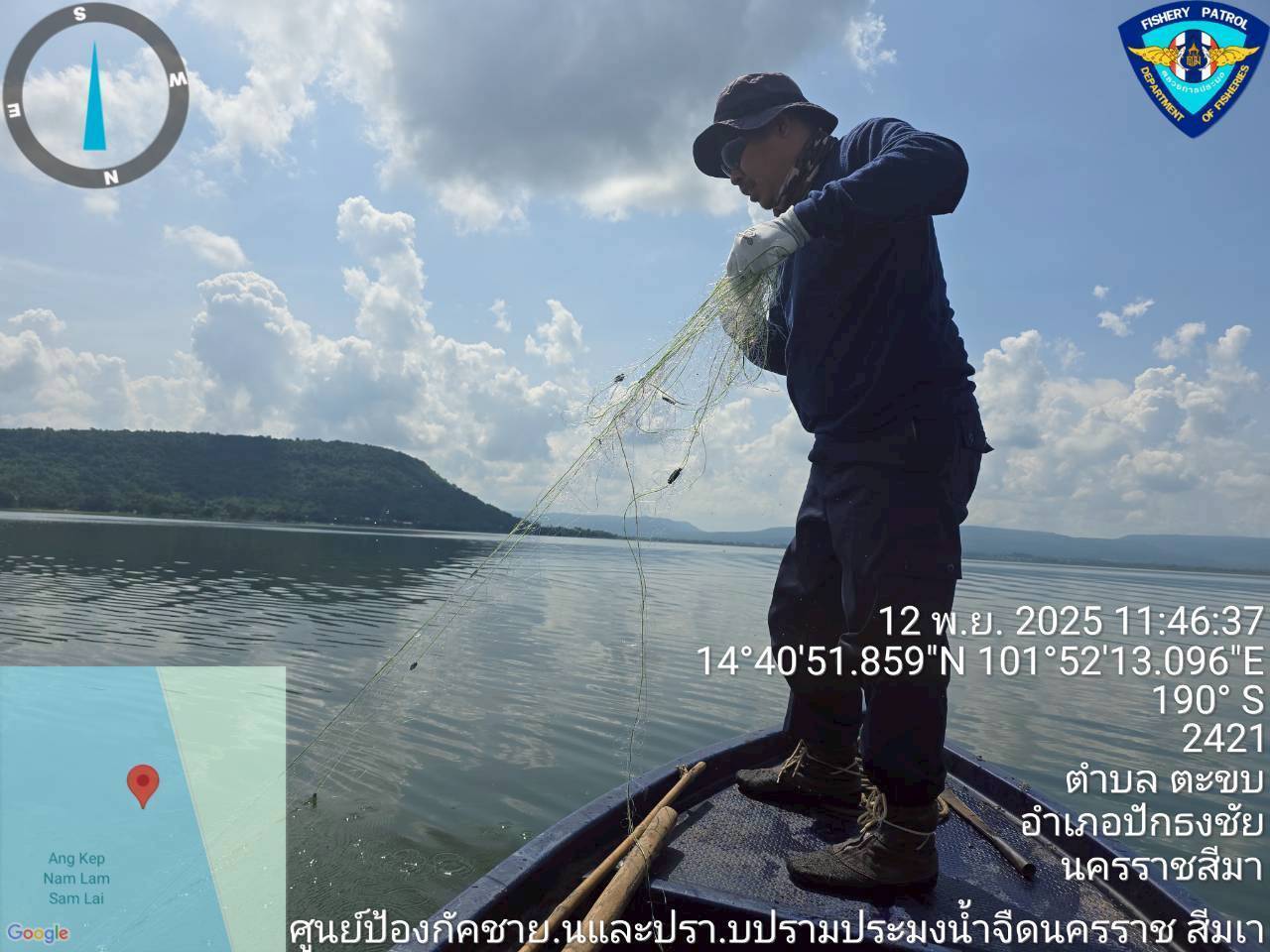 ลักลอบทำการประมง ในเขตพื้นที่รักษาพืชพันธ์ โดยไม่ได้รับอนุญาต บริเวณอ่างเก็บน้ำลำสำลาย ตำบลตะขบ อำเภอปักธงชัย จังหวัดนครราชสีมา นำส่งพนักงานสอบสวน สถานีตำรวจภูธรปักธงชัย อำเภอปักธงชัย จังหวัดนครราชสีมา เพื่อลงบันทึกประจำวันไว้เป็นหลักฐาน ตาม ปจว. ข้อ 2 ลงวันที่ 12 พฤศจิกายน 2568 เวลา 13.42 น. พนักงานสอบสวน ร.ต.อ.อิศรา จรรยาภินันท์   ผู้รับแจ้งความไว้ วันที่ 12 พฤศจิกายน 2568 ศูนย์ป้องกันและปราบปรามประมงน้ำจืดนครราชสีมา โดยนายชูศักดิ์ จงงาม ผู้อำนวยการศูนย์ฯ มอบหมายให้นายชาญชัย อ่องสันเทียะ เจ้าพนักงานประมงปฏิบัติงาน  และเจ้าหน้าที่ศูนย์ฯ จำนวน 4 นาย ออกปฏิบัติงานควบคุมเฝ้าระวังการทำการประมงผิดกฎหมาย พื้นที่บริเวณอ่างเก็บน้ำลำสำลายตำบลตะขบ อำเภอปักธงชัย จังหวัดนครราชสีมา ดำเนินการยึดเครื่องมือทำการประมง ของกลาง จำนวน 1 รายการ ดังนี้
