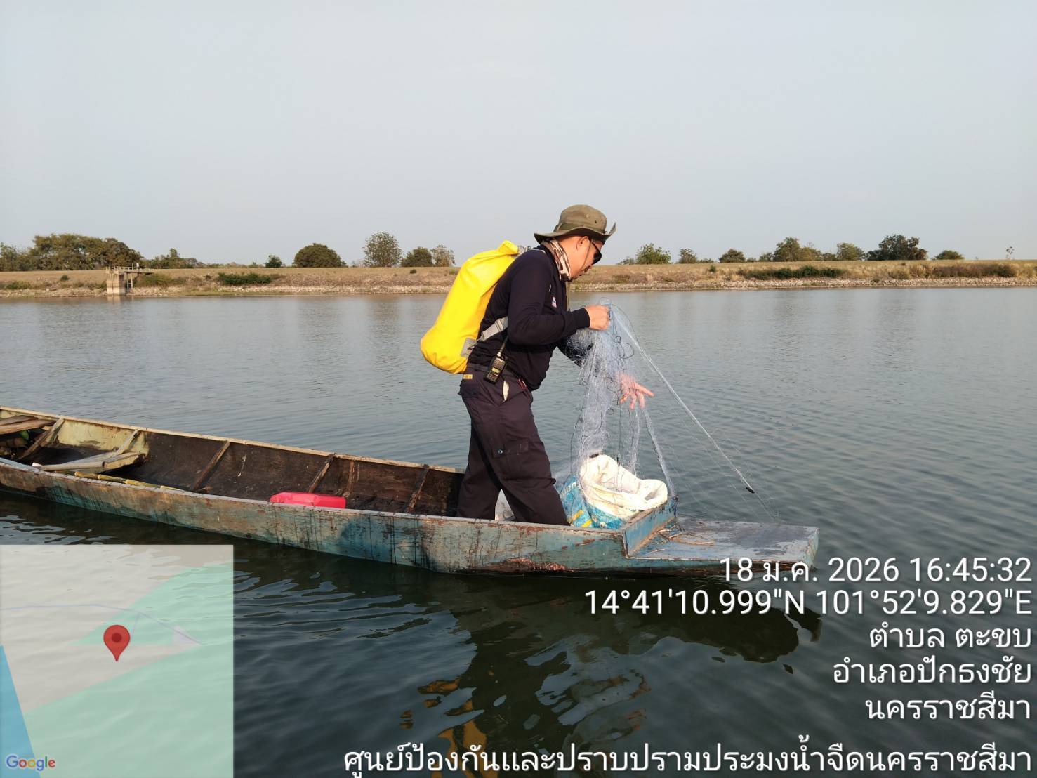 ลักลอบทำการประมง ในเขตพื้นที่รักษาพืชพันธุ์ โดยไม่ได้รับอนุญาต บริเวณอ่างเก็บน้ำลำสำลาย ตำบลตะขบ อำเภอปักธงชัย จังหวัดนครราชสีมา นำส่งพนักงานสอบสวน สถานีตำรวจภูธรปักธงชัย อำเภอปักธงชัย จังหวัดนครราชสีมา เพื่อลงบันทึกประจำวันไว้เป็นหลักฐาน ตาม ปจว. ข้อ 2 ลงวันที่18 มกราคม 2569 เวลา 18.45 น. พนักงานสอบสวน ร.ต.ท.โสมนัส ณลูทอง ผู้รับแจ้งความไว้วันที่18 มกราคม 2569 ศูนย์ป้องกันและปราบปรามประมงน้ำจืดนครราชสีมา โดยนายชูศักดิ์ จงงาม ผู้อำนวยการศูนย์ฯ มอบหมายให้นายชาญชัย อ่องสันเทียะ เจ้าพนักงานประมงปฏิบัติงาน  และเจ้าหน้าที่ศูนย์ฯ ออกปฏิบัติงานควบคุมเฝ้าระวังการทำการประมงผิดกฎหมาย พื้นที่บริเวณอ่างเก็บน้ำลำสำลาย ตำบลตะขบ อำเภอปักธงชัย จังหวัดนครราชสีมา ดำเนินการยึดเครื่องมือทำการประมง ของกลาง จำนวน 5 รายการ ดังนี้