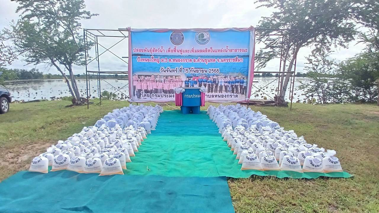 ร่วมปล่อยพันธุ์สัตว์น้ำเพื่อฟื้นฟูและเพิ่มผลผลิตในแหล่งน้ำสาธารณะ ณ บึงหนองใหญ่ อำเภอด่านขุนทด จังหวัดนครราชสีมา