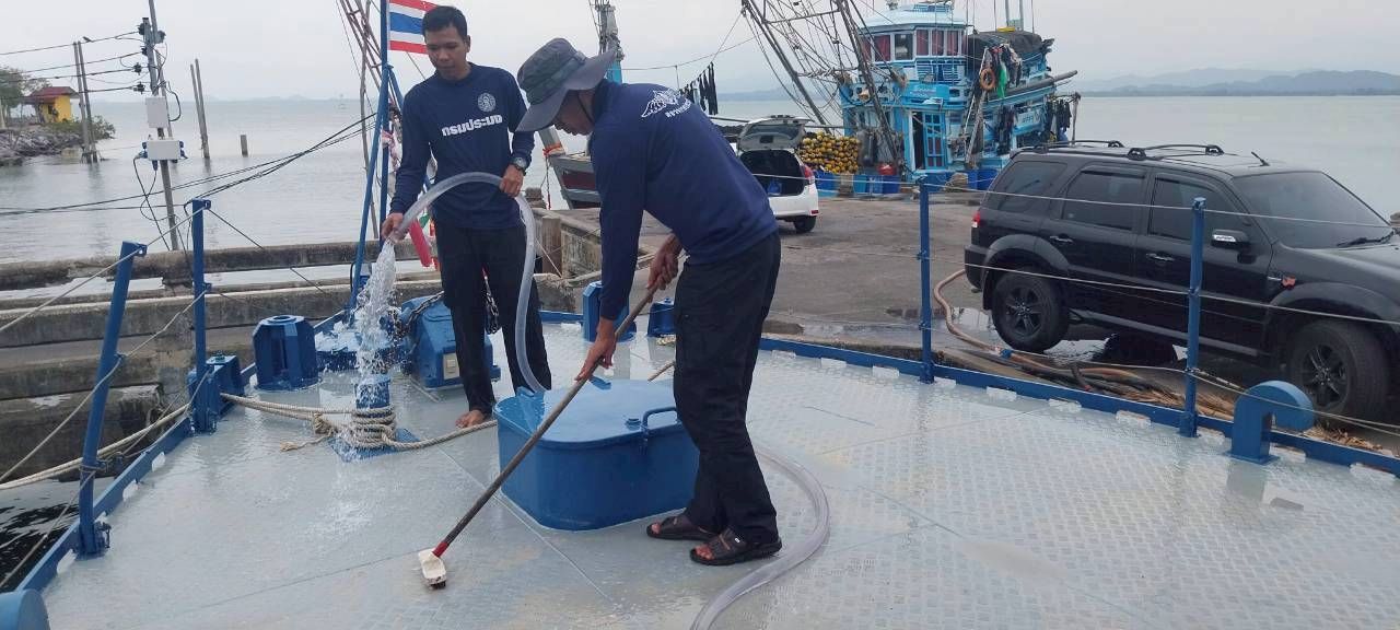 วันที่ 23 ม.ค. 69 นปท.บางสะพานฯ ศปท.ชุมพร กองตรวจการประมง กรมประมง โดย นายสมชาย ศรีสวัสดิ์ หน.นปท. บางสะพานฯ พร้อมเจ้าหน้าที่หน่วยฯ ทำความสะอาดภายใน – ภายนอก ตัวเรือ เพื่อเตรียมความพร้อมนำเรือตรวจประมงทะเล 611 ร่วมพิธีประกาศใช้มาตรการบริหารจัดการทรัพยากรสัตว์น้ำในฤดูสัตว์น้ำมีไข่วางไข่ และเลี้ยงตัวอ่อนวันที่ 13 กุมภาพันธ์ 2569 ณ บริเวณท่าเทียบเรือประมงชุมพร ต.ปากน้ำ อ.เมือง จ.ชุมพร เพื่อได้รับทราบ