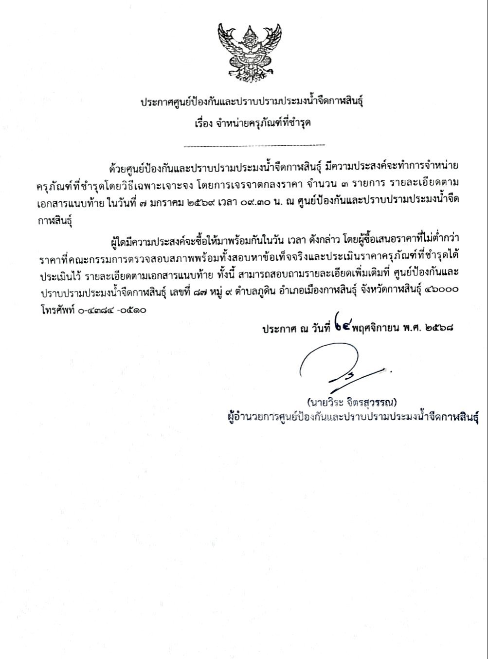 ด้วยศูนย์ป้องกันและปราบปรามประมงน้ำจืดกาฬสินธุ์ มีความประสงค์จะทำการจำหน่ายครุภัณฑ์ที่ชำรุด โดยวิธีเฉพาะเจาะจง และการเจรจาตกลงราคา จำนวน ๓ รายการ รายละเอียดดตามเอกสารแนบท้าย ในวันที่ ๗ มกราคม ๒๕๖๙ เวลา ๐๙.๓๐ น. ณ ศูนย์ป้องกันและปราบปรามปรามกาฬสินธุ์
