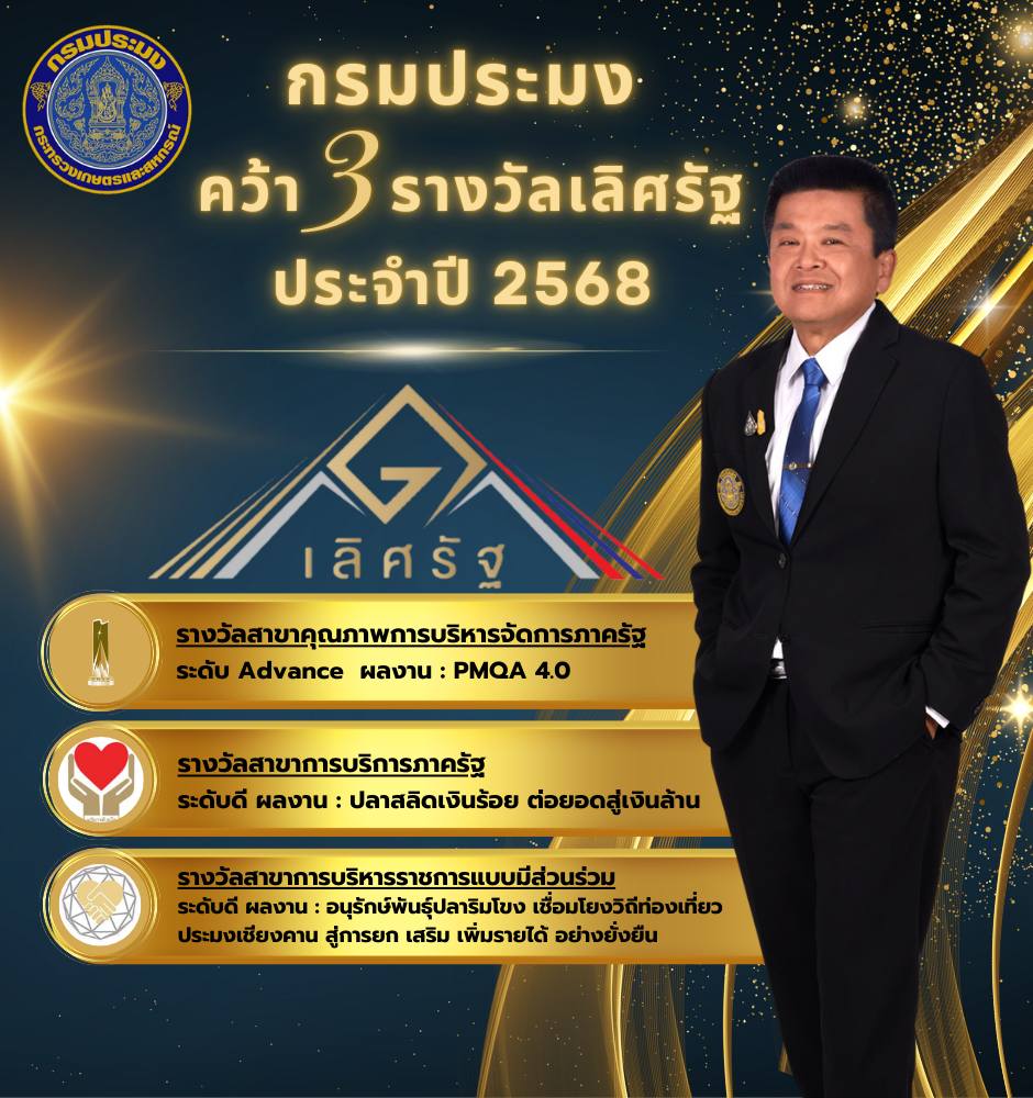 สำหรับช่วงพิธีรับรางวัลเลิศรัฐ ประจำปี พ.ศ. 2568 กรมประมงได้รับรางวัลเลิศรัฐ จำนวน 3 สาขา 3 ประเภท 3 รางวัล ได้แก่ 1. สาขารางวัลคุณภาพบริหารจัดการภาครัฐ ระดับก้าวหน้า (Advance) จากผลงาน PMQA 4.0 ซึ่งเป็นรางวัลมอบให้กับหน่วยงานของภาครัฐที่มีความมุ่งมั่นตั้งใจในการพัฒนาคุณภาพการบริหารจัดการขององค์กร ระดับก้าวหน้า (Advance)