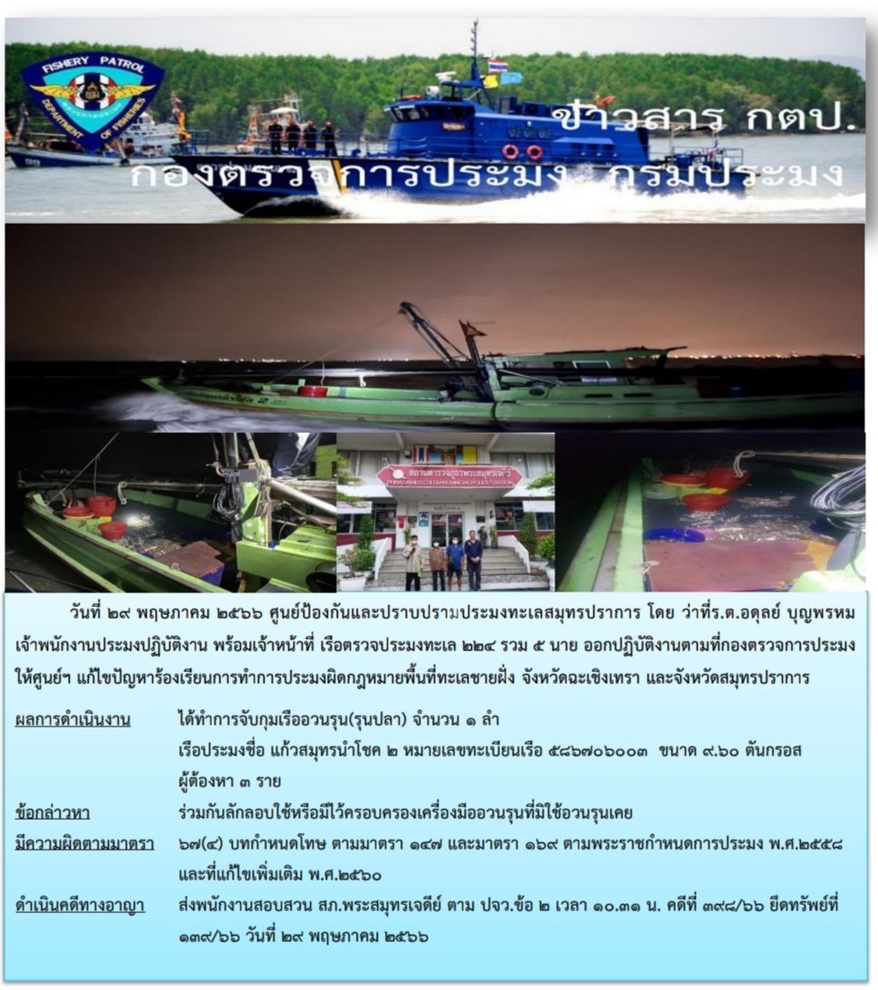 ผลการปฏิบัติงาน ได้ทำการจับกุมเรืออวนรุน(รุนปลา) จำนวน 1 ลำ เรือประมงชื่อ แก้วสมุทรนำโชค 2 หมายเลขทะเบียน 586706003  ขนาด 9.60 ตันกรอส ผู้ต้องหา 3 ราย   ข้อกล่าวหา ร่วมกันลักลอบใช้หรือมีไว้ครอบครองเครื่องมืออวนรุนที่มิใช่อวนรุนเคย มีความผิดตามมาตรา 64(4) บทกำหนดโทษ 147 และ169 ส่งดำเนินคดี สภ.พระสมุทรเจดีย์ ตามปจว.ข้อ 2 เวลา 10.31 น.คดีที่398/66 ยึดทรัพย์ที่ 139/66วันที่ 29 พฤษภาคม 2566