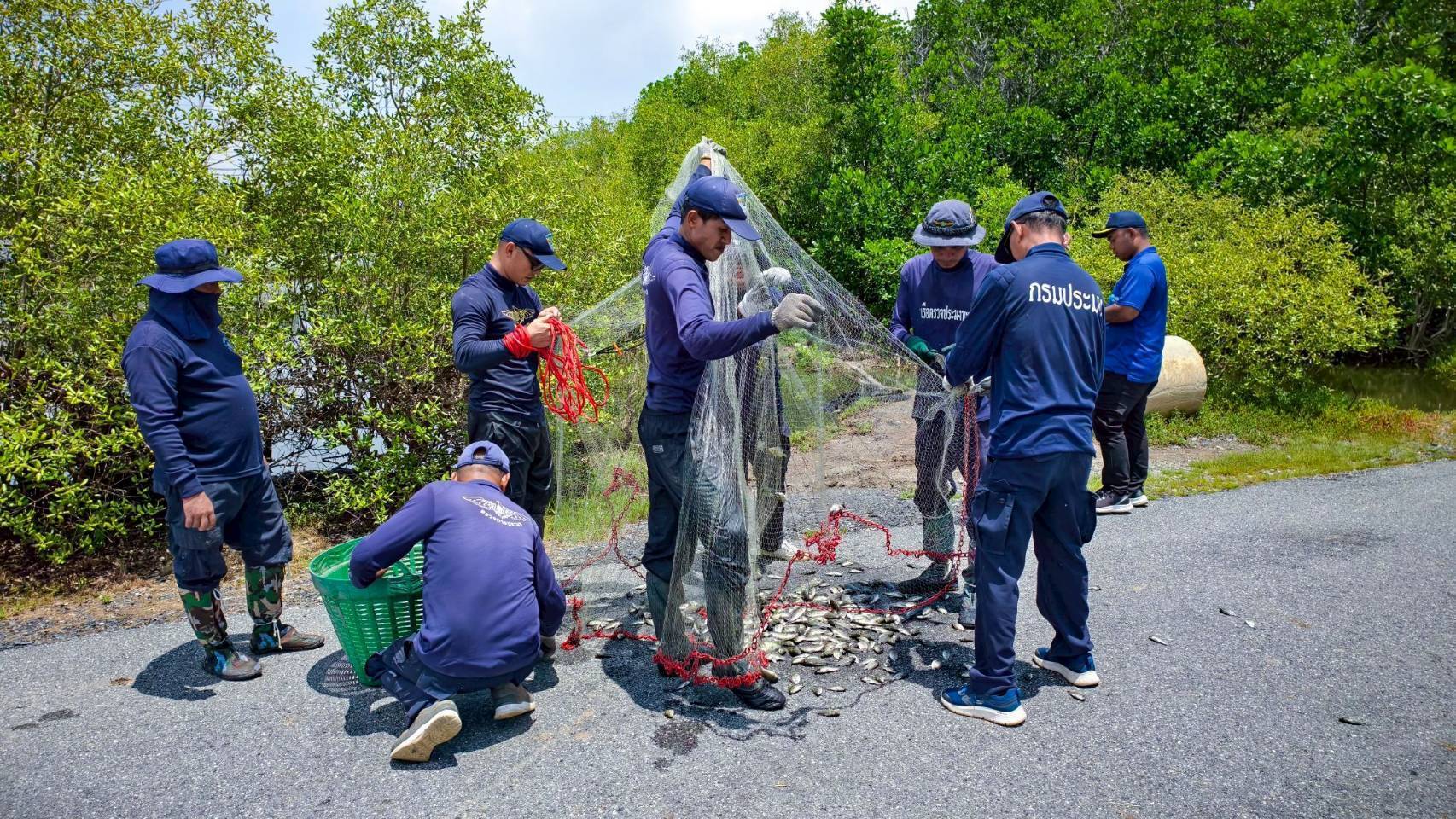 วันที่  12 กันยายน 2568 ศูนย์ป้องกันและปราบปรามประมงทะเลสมุทรปราการ โดย นาย ศราวุธ วันระยานนท์ ตำแหน่งผู้อำนวยการศูนย์ป้องกันและปราบปรามประมงทะเลสมุทรปราการ  พร้อมเจ้าหน้าที่ศูนย์ฯรวม 9 นาย ร่วมกับสำนักงานประมงจังหวัดสมุทรปราการ ศูนย์วิจัยและพัฒนาการเพาะเลี้ยงสัตว์น้ำจืดสมุทรปราการ ศูนย์วิจัยและพัฒนาประมงทะเลสมุทรปราการ ศูนย์วิจัยและพัฒนาการเพาะเลี้ยงสัตว์น้ำชายฝั่งฉะเชิงเทราและศูนย์บริหารจัดการด่านตรวจประมงเขต 3(กรุงเทพมหานคร) ศูนย์วิจัยและพัฒนาประมงทะเลสมุทรปราการ ศูนย์ป้องกันและปราบปรามประมงน้ำจืดพระนครศรีอยุธยา ร่วมโครงการกิจกรรมบรูณาการช่วยเหลือสังคม กำจัดปลาหมอคางดำ(ในรูปแบบ CSR) "ลงแขกลงคลอง" ณ บริเวณแหล่งน้ำพื้นที่ศูนย์ศึกษาธรรมชาติกองทัพบกบางปู(สถานตากอากาศบางปู) ตำบลบางปูใหม่ อำเภอเมืองสมุทรปราการ จังหวัดสมุทรปราการ โดยจับปลาหมอคางดำได้ 100 กิโลกรัม