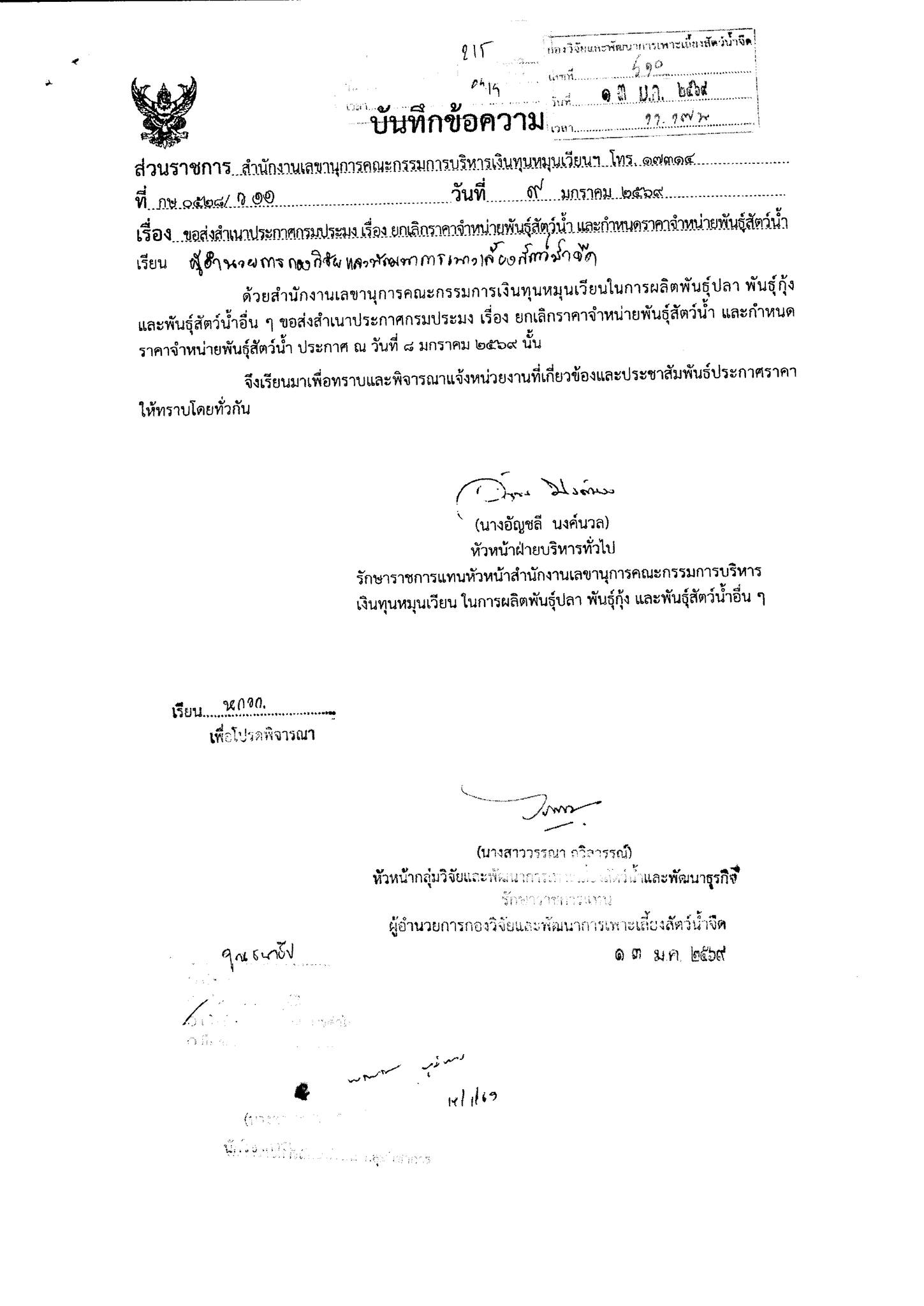ประกาศกรมประมง เรื่อง ยกเลิกราคาจำหน่ายพันธุ์สัตว์น้ำ และกำหนดราคาจำหน่ายพันธุ์สัตว์น้ำ..คลิก