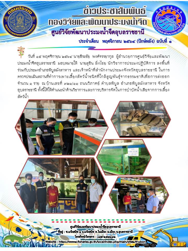 วันที่ 15 พฤศจิกายน 2564 นายธีระชัย  พงศ์จรรยากุล  ผู้อำนวยการศูนย์วิจัยและพัฒนาประมงน้ำจืดอุบลราชธานี  มอบหมายให้  นายสุชิน มิ่งไชย นักวิชาการประมงปฏิบัติการ ลงพื้นที่ร่วมกับประมงอำเภอพิบูลมังสาหาร และเจ้าหน้าที่สำนักงานประมงจังหวัดอุบลราชธานี ในการตรวจประเมินสถานที่ทำการเพาะเลี้ยงสัตว์น้ำชนิดที่ใกล้สูญพันธุ์จากธรรมชาติเพื่อการส่งออก จำนวน 1 ราย  ณ บ้านเลขที่ 321/11 ถนนวิภาคย์ ตำบลพิบูล อำเภอพิบูลมังสาหาร จังหวัดอุบลราชธานี ทั้งนี้ได้ให้คำแนะนำด้านวิชาการและการบริหารจัดในการบำบัดน้ำเสียจากการเลี้ยงสัตว์น้ำ