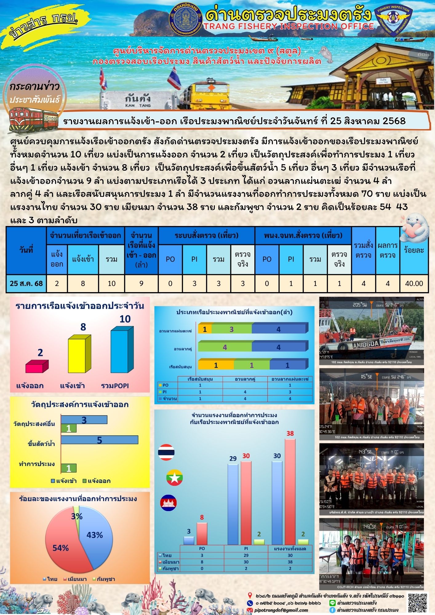 วันจันทร์ ที่ 25 สิงหาคม 2568 ศูนย์ควบคุมการแจ้งเรือเข้าออกตรัง สังกัดด่านตรวจประมงตรัง มีการแจ้งเข้าออกของเรือประมงพาณิชย์ ทั้งหมดจำนวน 10 เที่ยว แบ่งเป็นการแจ้งออก จำนวน 2 เที่ยว เป็นวัตถุประสงค์เพื่อทำการประมง 1 เที่ยว อื่นๆ 1 เที่ยว แจ้งเข้า จำนวน 8 เที่ยว  เป็นวัตถุประสงค์เพื่อขึ้นสัตว์น้ำ 5 เที่ยว อื่นๆ 3 เที่ยว มีจำนวนเรือที่แจ้งเข้าออกจำนวน 9 ลำ แบ่งตามประเภทเรือได้ 3 ประเภท ได้แก่ อวนลากแผ่นตะเฆ่ จำนวน 4 ลำ ลากคู่ 4 ลำ และเรือสนับสนุนการประมง 1 ลำ มีจำนวนแรงงานที่ออกทำการประมงทั้งหมด 70 ราย แบ่งเป็นแรงงานไทย จำนวน 30 ราย เมียนมา จำนวน 38 ราย และกัมพูชา จำนวน 2 ราย คิดเป็นร้อยละ 43  54  และ 3 ตามลำดับ