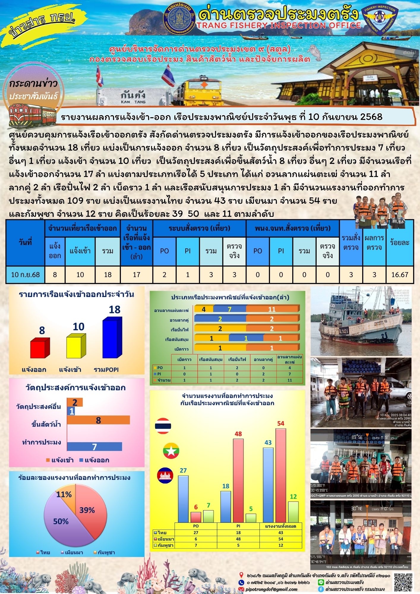 วันพุธ ที่ 10 กันยายน 2568 ศูนย์ควบคุมการแจ้งเรือเข้าออกตรัง สังกัดด่านตรวจประมงตรัง มีการแจ้งเข้าออกของเรือประมงพาณิชย์ ทั้งหมดจำนวน 18 เที่ยว แบ่งเป็นการแจ้งออก จำนวน 8 เที่ยว เป็นวัตถุประสงค์เพื่อทำการประมง 7 เที่ยว อื่นๆ 1 เที่ยว แจ้งเข้า จำนวน 10 เที่ยว  เป็นวัตถุประสงค์เพื่อขึ้นสัตว์น้ำ 8 เที่ยว อื่นๆ 2 เที่ยว มีจำนวนเรือที่แจ้งเข้าออกจำนวน 17 ลำ แบ่งตามประเภทเรือได้ 5 ประเภท ได้แก่ อวนลากแผ่นตะเฆ่ จำนวน 11 ลำ ลากคู่ 2 ลำ เรือปั่นไฟ 2 ลำ เบ็ดราว 1 ลำ และเรือสนับสนุนการประมง 1 ลำ มีจำนวนแรงงานที่ออกทำการประมงทั้งหมด 109 ราย แบ่งเป็นแรงงานไทย จำนวน 43 ราย เมียนมา จำนวน 54 ราย และกัมพูชา จำนวน 12 ราย คิดเป็นร้อยละ 39  50  และ 11 ตามลำดับ