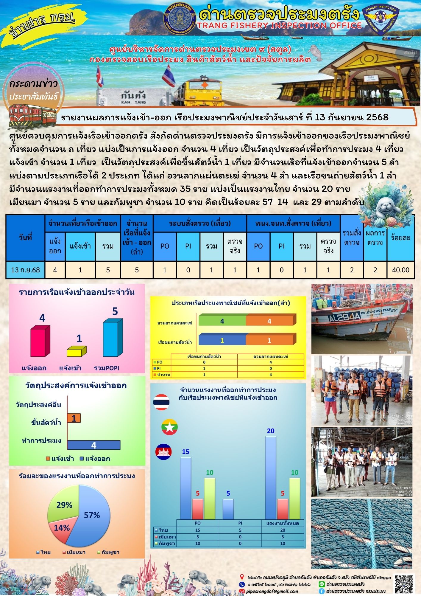 วันเสาร์ ที่ 13 กันยายน 2568 ศูนย์ควบคุมการแจ้งเรือเข้าออกตรัง สังกัดด่านตรวจประมงตรัง มีการแจ้งเข้าออกของเรือประมงพาณิชย์ ทั้งหมดจำนวน ถ เที่ยว แบ่งเป็นการแจ้งออก จำนวน 4 เที่ยว เป็นวัตถุประสงค์เพื่อทำการประมง 4 เที่ยว แจ้งเข้า จำนวน 1 เที่ยว  เป็นวัตถุประสงค์เพื่อขึ้นสัตว์น้ำ 1 เที่ยว มีจำนวนเรือที่แจ้งเข้าออกจำนวน 5 ลำ แบ่งตามประเภทเรือได้ 2 ประเภท ได้แก่ อวนลากแผ่นตะเฆ่ จำนวน 4 ลำ และเรือขนถ่ายสัตว์น้ำ 1 ลำ มีจำนวนแรงงานที่ออกทำการประมงทั้งหมด 35 ราย แบ่งเป็นแรงงานไทย จำนวน 20 ราย เมียนมา จำนวน 5 ราย และกัมพูชา จำนวน 10 ราย คิดเป็นร้อยละ 57  14  และ 29 ตามลำดับ