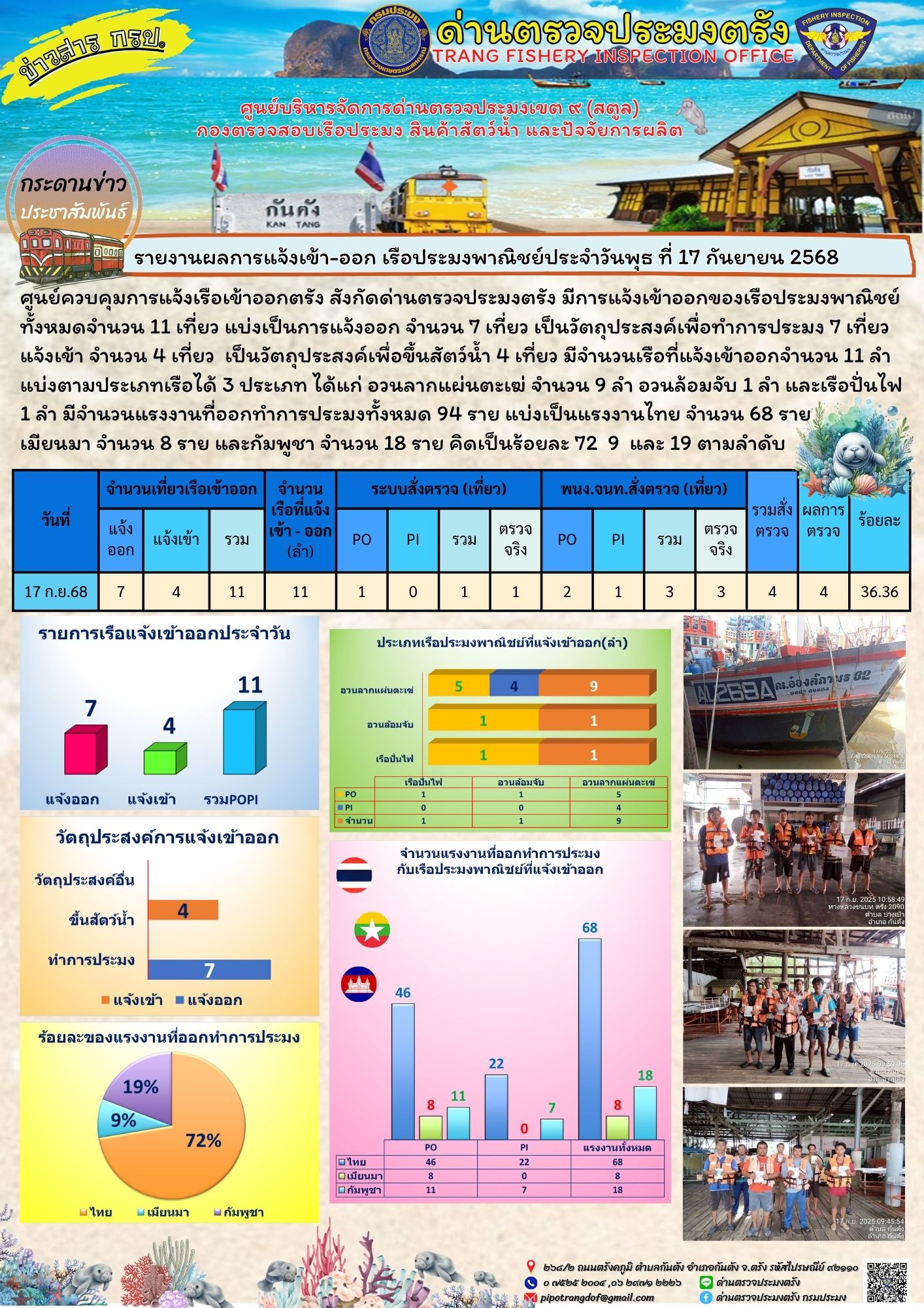 #ผลการแจ้งเข้าออกและการตรวจสอบเรือประมงประจำวันที่ 17 กันยายน 2568..คลิก