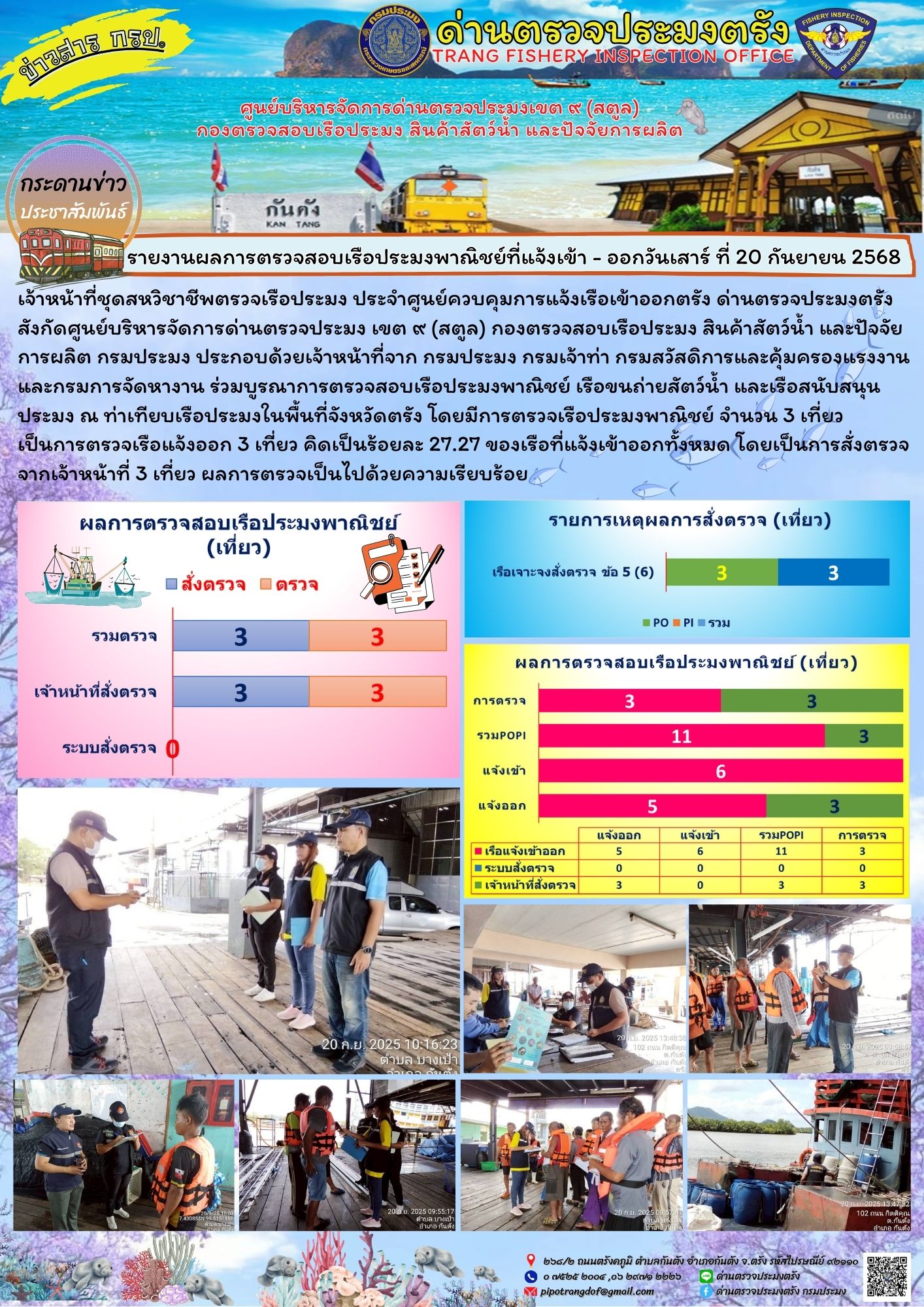 วันเสาร์ ที่ 20 กันยายน 2568 เจ้าหน้าที่ชุดสหวิชาชีพตรวจเรือประมง ประจำศูนย์ควบคุมการแจ้งเรือเข้าออกตรัง ด่านตรวจประมงตรัง สังกัดศูนย์บริหารจัดการด่านตรวจประมง เขต ๙ (สตูล) กองตรวจสอบเรือประมง สินค้าสัตว์น้ำ และปัจจัยการผลิต กรมประมง ประกอบด้วยเจ้าหน้าที่จาก กรมประมง กรมเจ้าท่า กรมสวัสดิการและคุ้มครองแรงงาน และกรมการจัดหางาน ร่วมบูรณาการตรวจสอบเรือประมงพาณิชย์ เรือขนถ่ายสัตว์น้ำ และเรือสนับสนุนประมง ณ ท่าเทียบเรือประมงในพื้นที่จังหวัดตรัง โดยมีการตรวจเรือประมงพาณิชย์ จำนวน 3 เที่ยว เป็นการตรวจเรือแจ้งออก 3 เที่ยว คิดเป็นร้อยละ 27.27 ของเรือที่แจ้งเข้าออกทั้งหมด โดยเป็นการสั่งตรวจจากเจ้าหน้าที่ 3 เที่ยว ผลการตรวจเป็นไปด้วยความเรียบร้อย