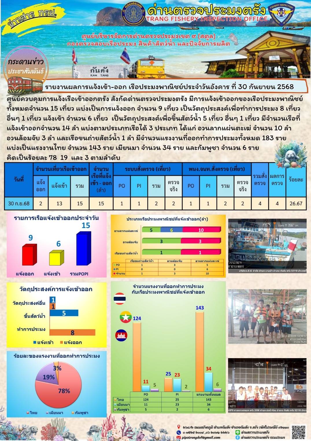 วันอังคาร ที่ 30 กันยายน 2568 ศูนย์ควบคุมการแจ้งเรือเข้าออกตรัง สังกัดด่านตรวจประมงตรัง มีการแจ้งเข้าออกของเรือประมงพาณิชย์ ทั้งหมดจำนวน 15 เที่ยว แบ่งเป็นการแจ้งออก จำนวน 9 เที่ยว เป็นวัตถุประสงค์เพื่อทำการประมง 8 เที่ยว อื่นๆ 1 เที่ยว แจ้งเข้า จำนวน 6 เที่ยว  เป็นวัตถุประสงค์เพื่อขึ้นสัตว์น้ำ 5 เที่ยว อื่นๆ 1 เที่ยว มีจำนวนเรือที่แจ้งเข้าออกจำนวน 14 ลำ แบ่งตามประเภทเรือได้ 3 ประเภท ได้แก่ อวนลากแผ่นตะเฆ่ จำนวน 10 ลำ อวนล้อมจับ 3 ลำ และเรือขนถ่ายสัตว์น้ำ 1 ลำ มีจำนวนแรงงานที่ออกทำการประมงทั้งหมด 183 ราย แบ่งเป็นแรงงานไทย จำนวน 143 ราย เมียนมา จำนวน 34 ราย และกัมพูชา จำนวน 6 ราย คิดเป็นร้อยละ 78  19  และ 3 ตามลำดับ