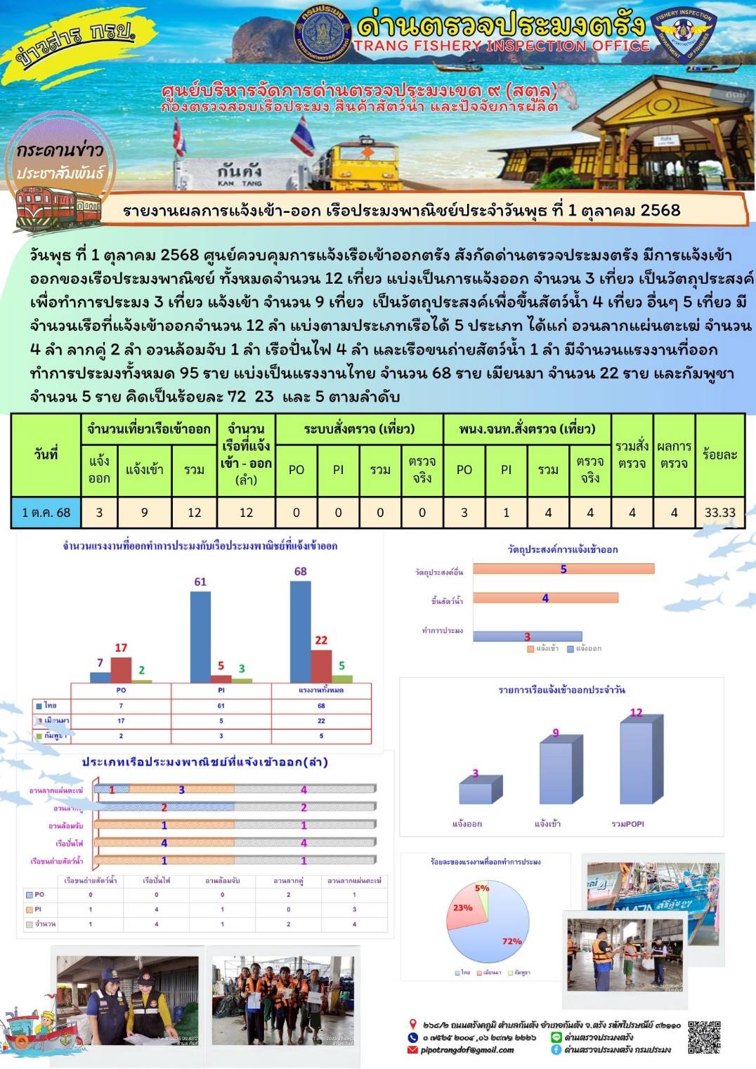 วันพุธ ที่ 1 ตุลาคม 2568 ศูนย์ควบคุมการแจ้งเรือเข้าออกตรัง สังกัดด่านตรวจประมงตรัง มีการแจ้งเข้าออกของเรือประมงพาณิชย์ ทั้งหมดจำนวน 12 เที่ยว แบ่งเป็นการแจ้งออก จำนวน 3 เที่ยว เป็นวัตถุประสงค์เพื่อทำการประมง 3 เที่ยว แจ้งเข้า จำนวน 9 เที่ยว  เป็นวัตถุประสงค์เพื่อขึ้นสัตว์น้ำ 4 เที่ยว อื่นๆ 5 เที่ยว มีจำนวนเรือที่แจ้งเข้าออกจำนวน 12 ลำ แบ่งตามประเภทเรือได้ 5 ประเภท ได้แก่ อวนลากแผ่นตะเฆ่ จำนวน 4 ลำ ลากคู่ 2 ลำ อวนล้อมจับ 1 ลำ เรือปั่นไฟ 4 ลำ และเรือขนถ่ายสัตว์น้ำ 1 ลำ มีจำนวนแรงงานที่ออกทำการประมงทั้งหมด 95 ราย แบ่งเป็นแรงงานไทย จำนวน 68 ราย เมียนมา จำนวน 22 ราย และกัมพูชา จำนวน 5 ราย คิดเป็นร้อยละ 72  23  และ 5 ตามลำดับ