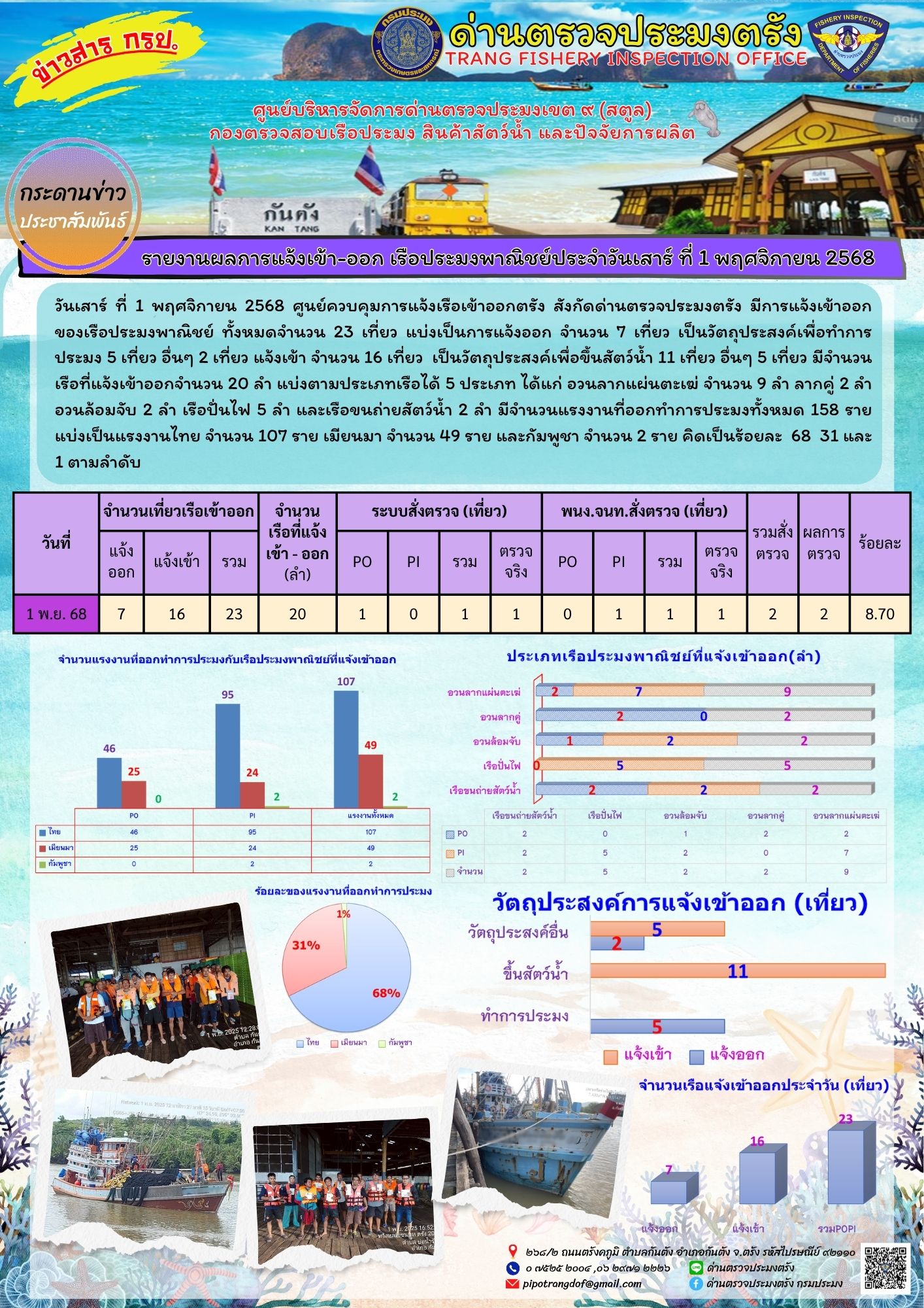 วันเสาร์ ที่ 1 พฤศจิกายน 2568 ศูนย์ควบคุมการแจ้งเรือเข้าออกตรัง สังกัดด่านตรวจประมงตรัง มีการแจ้งเข้าออกของเรือประมงพาณิชย์ ทั้งหมดจำนวน 23 เที่ยว แบ่งเป็นการแจ้งออก จำนวน 7 เที่ยว เป็นวัตถุประสงค์เพื่อทำการประมง 5 เที่ยว อื่นๆ 2 เที่ยว แจ้งเข้า จำนวน 16 เที่ยว  เป็นวัตถุประสงค์เพื่อขึ้นสัตว์น้ำ 11 เที่ยว อื่นๆ 5 เที่ยว มีจำนวนเรือที่แจ้งเข้าออกจำนวน 20 ลำ แบ่งตามประเภทเรือได้ 5 ประเภท ได้แก่ อวนลากแผ่นตะเฆ่ จำนวน 9 ลำ ลากคู่ 2 ลำ อวนล้อมจับ 2 ลำ เรือปั่นไฟ 5 ลำ และเรือขนถ่ายสัตว์น้ำ 2 ลำ มีจำนวนแรงงานที่ออกทำการประมงทั้งหมด 158 ราย แบ่งเป็นแรงงานไทย จำนวน 107 ราย เมียนมา จำนวน 49 ราย และกัมพูชา จำนวน 2 ราย คิดเป็นร้อยละ  68  31 และ 1 ตามลำดับ