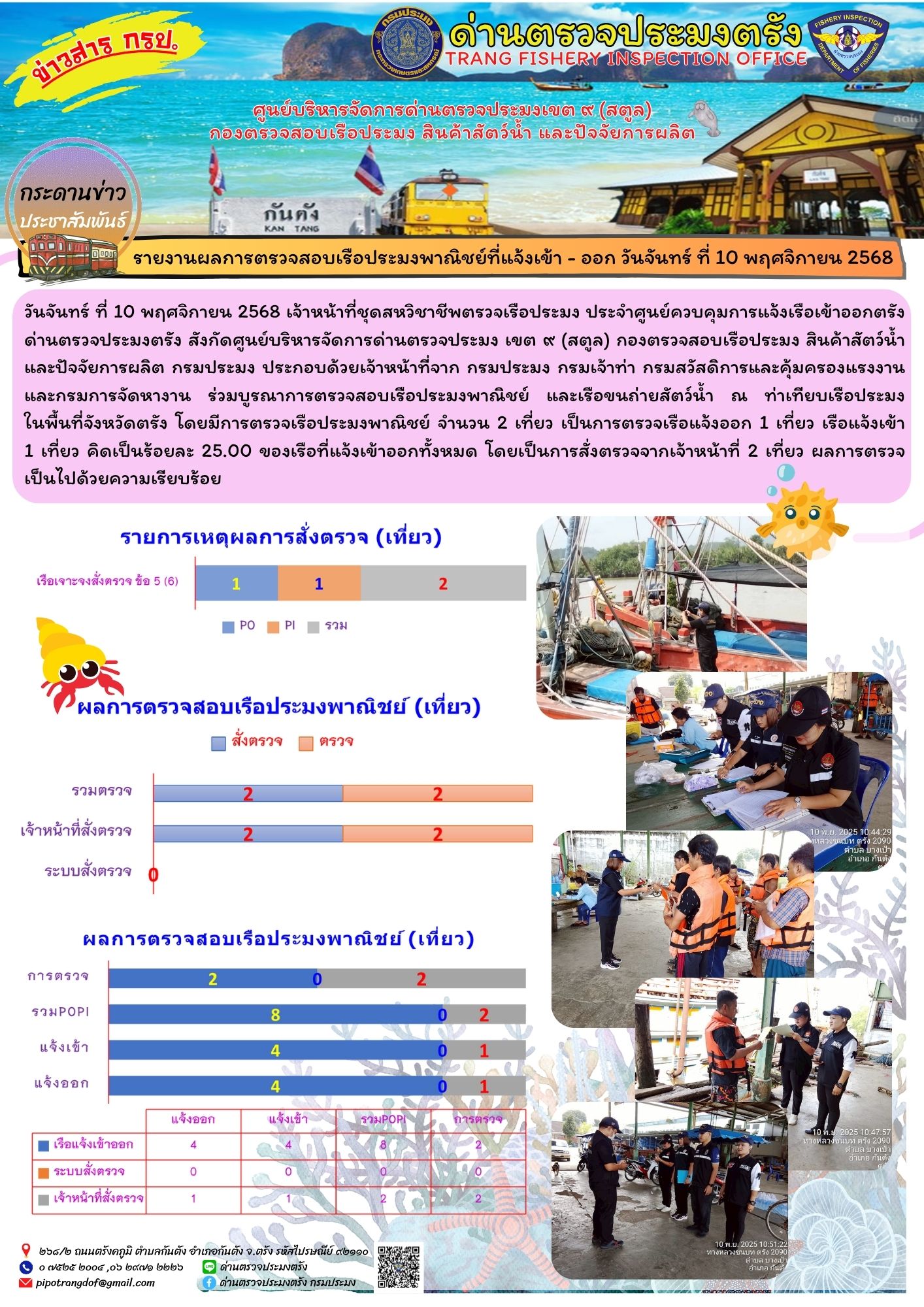 วันจันทร์ ที่ 10 พฤศจิกายน 2568 เจ้าหน้าที่ชุดสหวิชาชีพตรวจเรือประมง ประจำศูนย์ควบคุมการแจ้งเรือเข้าออกตรัง ด่านตรวจประมงตรัง สังกัดศูนย์บริหารจัดการด่านตรวจประมง เขต ๙ (สตูล) กองตรวจสอบเรือประมง สินค้าสัตว์น้ำ และปัจจัยการผลิต กรมประมง ประกอบด้วยเจ้าหน้าที่จาก กรมประมง กรมเจ้าท่า กรมสวัสดิการและคุ้มครองแรงงาน และกรมการจัดหางาน ร่วมบูรณาการตรวจสอบเรือประมงพาณิชย์ และเรือขนถ่ายสัตว์น้ำ ณ ท่าเทียบเรือประมงในพื้นที่จังหวัดตรัง โดยมีการตรวจเรือประมงพาณิชย์ จำนวน 2 เที่ยว เป็นการตรวจเรือแจ้งออก 1 เที่ยว เรือแจ้งเข้า 1 เที่ยว คิดเป็นร้อยละ 25.00 ของเรือที่แจ้งเข้าออกทั้งหมด โดยเป็นการสั่งตรวจจากเจ้าหน้าที่ 2 เที่ยว ผลการตรวจเป็นไปด้วยความเรียบร้อย