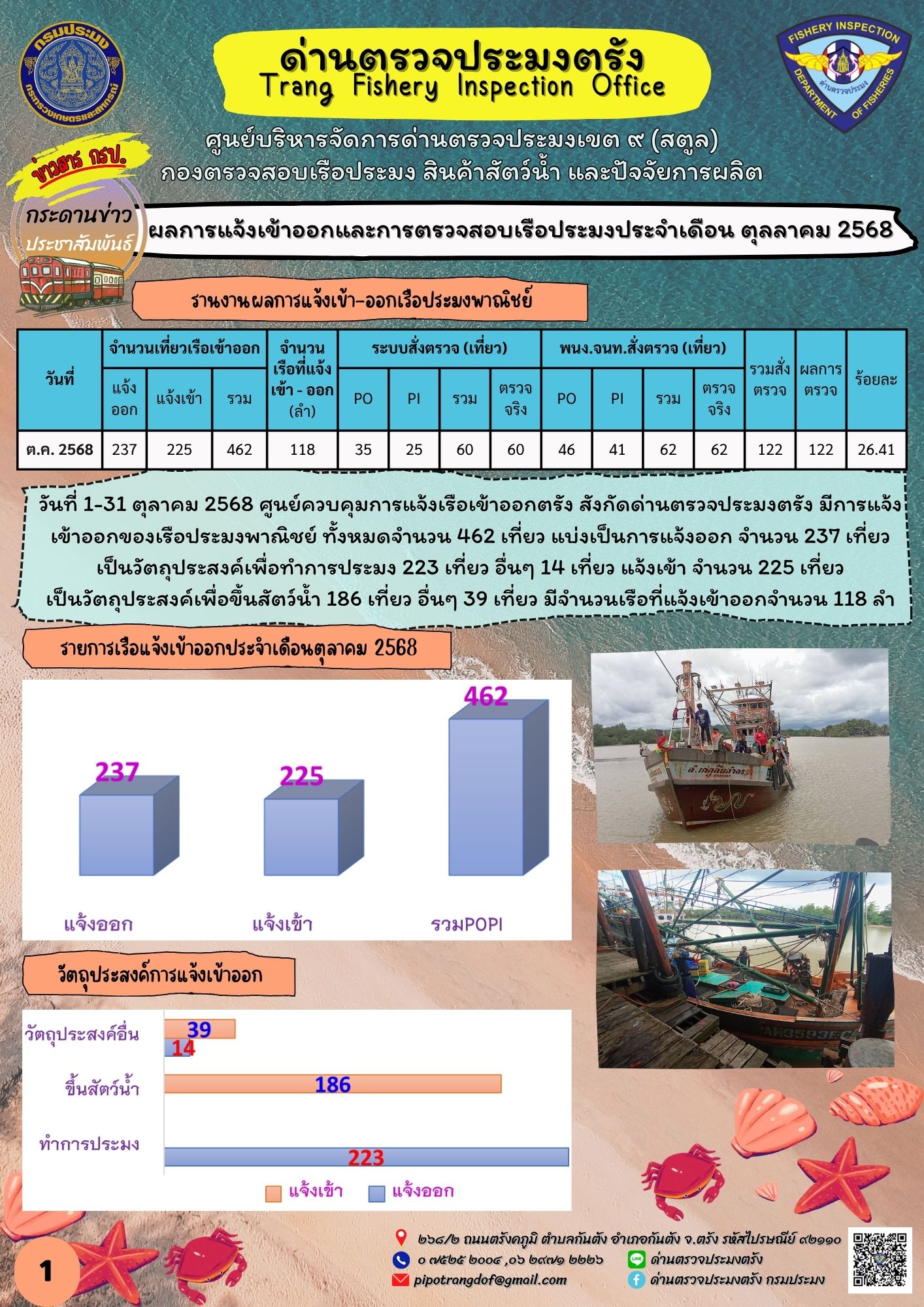 วันที่ 1-31 ตุลาคม 2568 ศูนย์ควบคุมการแจ้งเรือเข้าออกตรัง สังกัดด่านตรวจประมงตรัง มีการแจ้งเข้าออกของเรือประมงพาณิชย์ ทั้งหมดจำนวน 462 เที่ยว แบ่งเป็นการแจ้งออก จำนวน 237 เที่ยว เป็นวัตถุประสงค์เพื่อทำการประมง 223 เที่ยว อื่นๆ 14 เที่ยว แจ้งเข้า จำนวน 225 เที่ยว เป็นวัตถุประสงค์เพื่อขึ้นสัตว์น้ำ 186 เที่ยว อื่นๆ 39 เที่ยว มีจำนวนเรือที่แจ้งเข้าออกจำนวน 118 ลำ