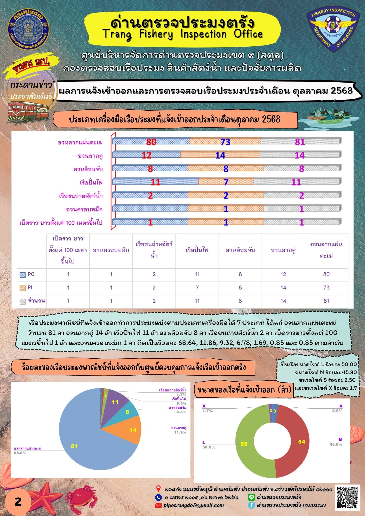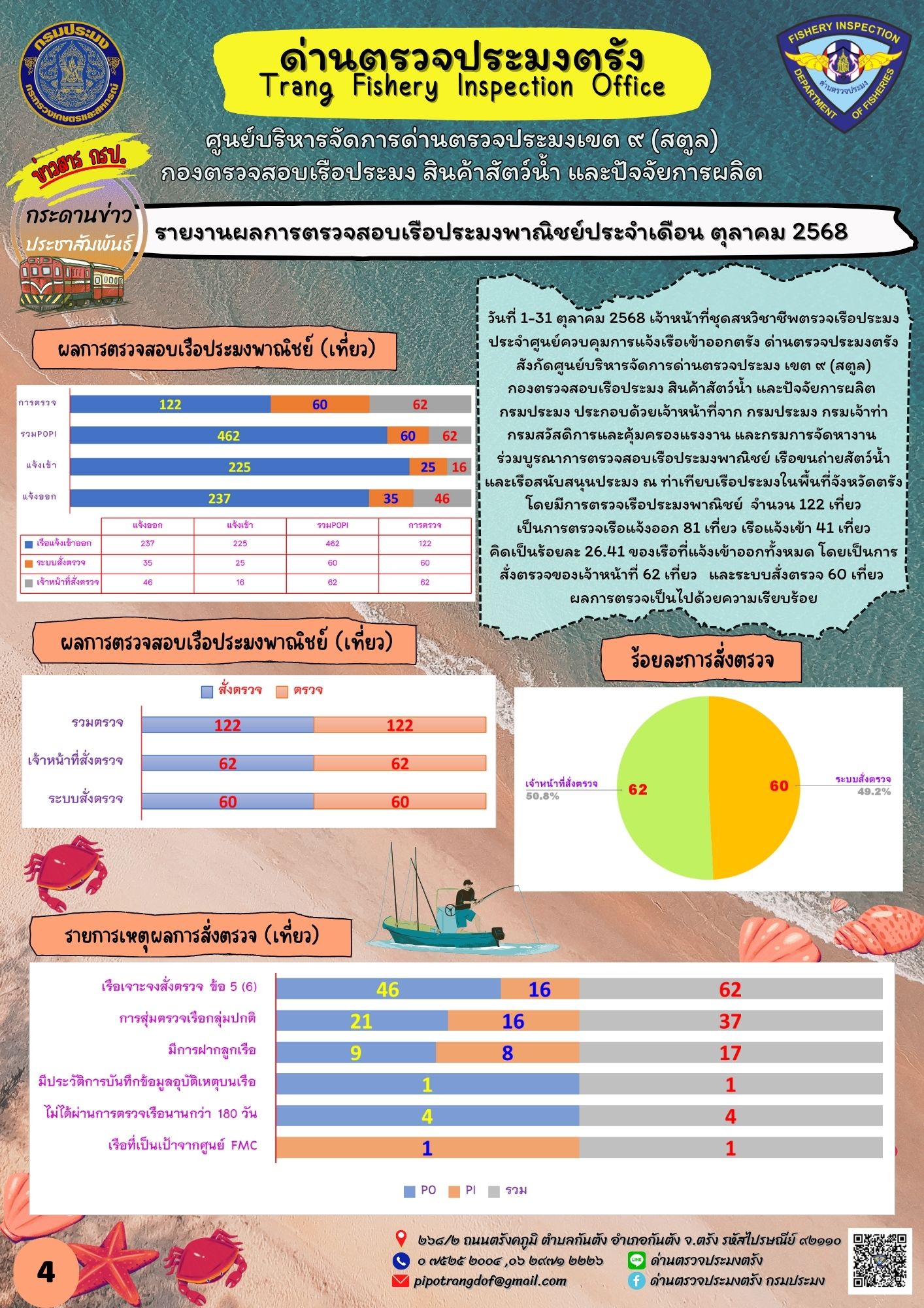 วันที่ 1-31 ตุลาคม 2568 เจ้าหน้าที่ชุดสหวิชาชีพตรวจเรือประมง ประจำศูนย์ควบคุมการแจ้งเรือเข้าออกตรัง ด่านตรวจประมงตรัง  ประกอบด้วยเจ้าหน้าที่จาก กรมประมง กรมเจ้าท่า กรมสวัสดิการและคุ้มครองแรงงาน และกรมการจัดหางาน ร่วมบูรณาการตรวจสอบเรือประมงพาณิชย์ เรือขนถ่ายสัตว์น้ำ และเรือสนับสนุนประมง ณ ท่าเทียบเรือประมงในพื้นที่จังหวัดตรัง โดยมีการตรวจเรือประมงพาณิชย์ จำนวน 122 เที่ยว เป็นการตรวจเรือแจ้งออก 81 เที่ยว เรือแจ้งเข้า 41 เที่ยว คิดเป็นร้อยละ 26.41 ของเรือที่แจ้งเข้าออกทั้งหมด โดยเป็นการสั่งตรวจของเจ้าหน้าที่ 62 เที่ยว และระบบสั่งตรวจ 60 เที่ยว ผลการตรวจเป็นไปด้วยความเรียบร้อย