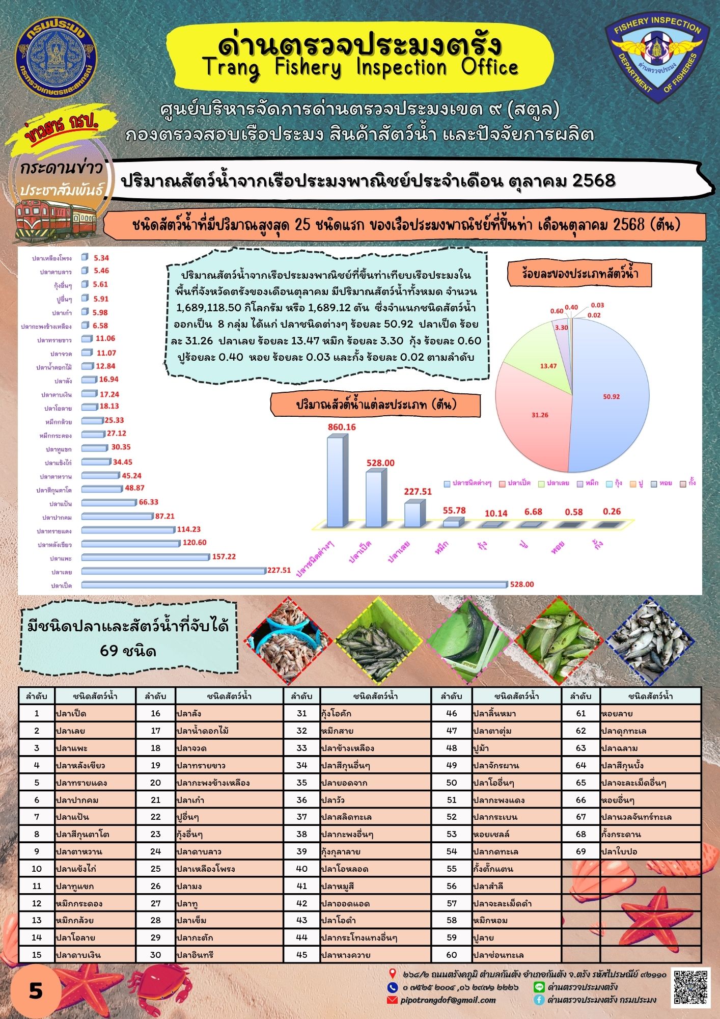 ปริมาณสัตว์น้ำจากเรือประมงพาณิชย์ที่ขึ้นท่าเทียบเรือประมงในพื้นที่จังหวัดตรังของเดือนตุลาคม มีปริมาณสัตว์น้ำทั้งหมด จำนวน 1,689,118.50 กิโลกรัม หรือ 1,689.12 ตัน โดยมีชนิดปลาและสัตว์น้ำที่จับได้ 69 ชนิด ซึ่งจำแนกชนิดสัตว์น้ำออกเป็น 8 กลุ่ม ได้แก่ ปลาชนิดต่างๆ ร้อยละ 50.92  ปลาเป็ด ร้อยละ 31.26  ปลาเลย ร้อยละ 13.47  หมึก ร้อยละ 3.30  กุ้ง ร้อยละ 0.60  ปูร้อยละ 0.40  หอย ร้อยละ 0.03 และกั้ง ร้อยละ 0.02 ตามลำดับ