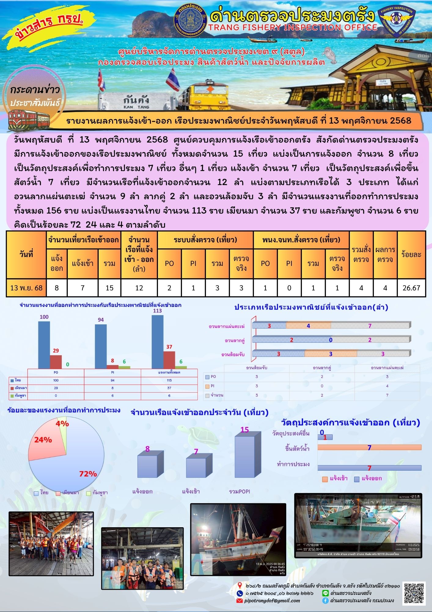 #ผลการแจ้งเข้าออกและการตรวจสอบเรือประมงประจำวันที่ 13 พฤศจิกายน 2568..คลิก